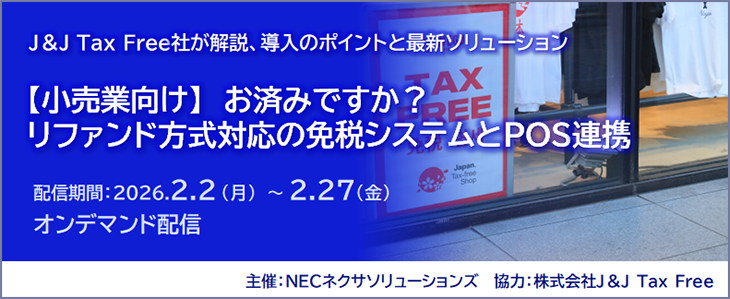 NECネクサソリューションズは、「お済みですか? リファンド方式対応の免税システムとPOS連携」を2026年2月27日(金)までオンデマンド配信します。お申し込みは2月26日(木)まで受け付けています。