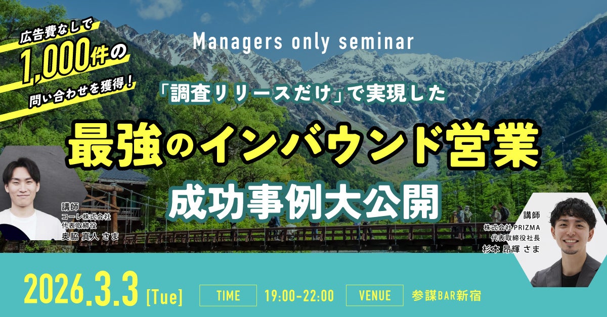 経営者コミュニティ「参謀」を運営する株式会社経営参謀(本社:東京都新宿区、代表取締役:新谷 健司、以下「経営参謀」)は、2026年3月3日(火)、中小・ベンチャー企業の経営者を対象とした勉強会『広告費なしで1,000件の問い合わせを獲得!「調査リリースだけ」で実現した最強のインバウンド営業成功事例』を開催いたします。本イベントでは、調査データを用いた広報手法「調査リリース」を活用し、広告費をかけずに年間1,000件のリード獲得と、大企業DX担当者との商談・成約を実現したコーレ株式会社 代表取締役 奥脇 真人氏を講師に招き、その具体的なノウハウを公開します。なお、本会は会員制コミュニティ「参謀」のイベントですが、今回は特別に一般の経営者様も「体験参加」が可能となっております。