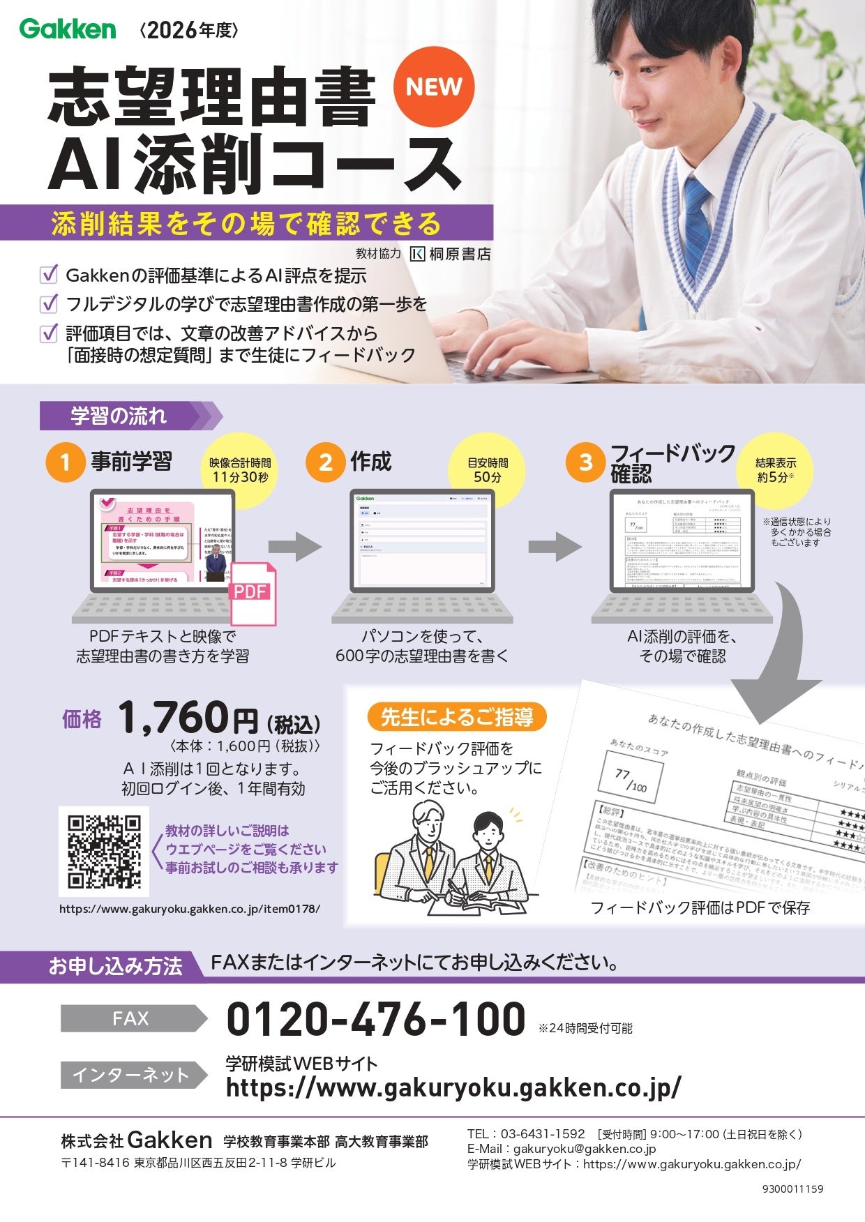 「大学入試面接対策映像講座」とGakkenが販売する添削教材「志望理由書シリーズ」や「小論文シリーズ」をセットで採用していただいた場合、「大学入試面接対策映像講座」を割引販売するキャンペーンを実施中です。受付は2026年3月31日(火)まで。