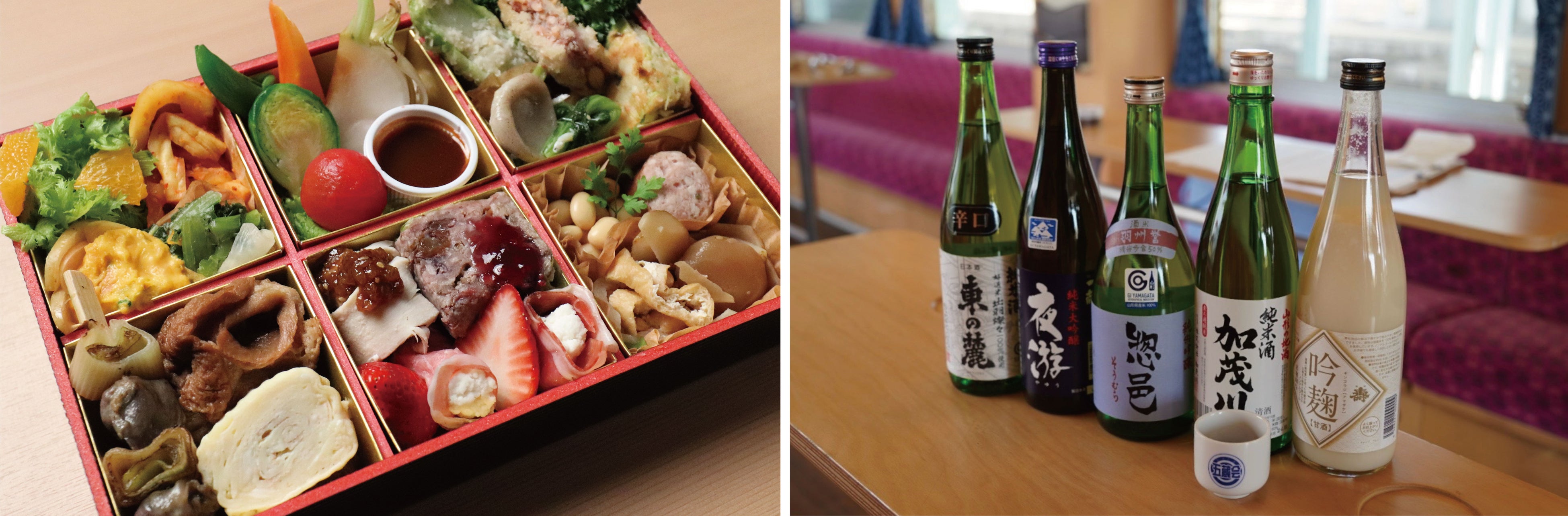 3月20日(祝金)、山形鉄道株式会社とやまがたアルカディア観光局と連携した「地酒と地元食材を楽しむ“地酒列車”」のプレミアム版「プレミアム地酒列車」が開催。列車内で提供される、「タスパークホテル長井」が手掛ける地酒ペアリングランチボックスを、「タスパークホテル長井」とのコラボレーションにより八芳園が監修いたします。置賜エリアの食材をふんだんに使用したオリジナルランチボックスと地酒のマリアージュをお愉しみください。