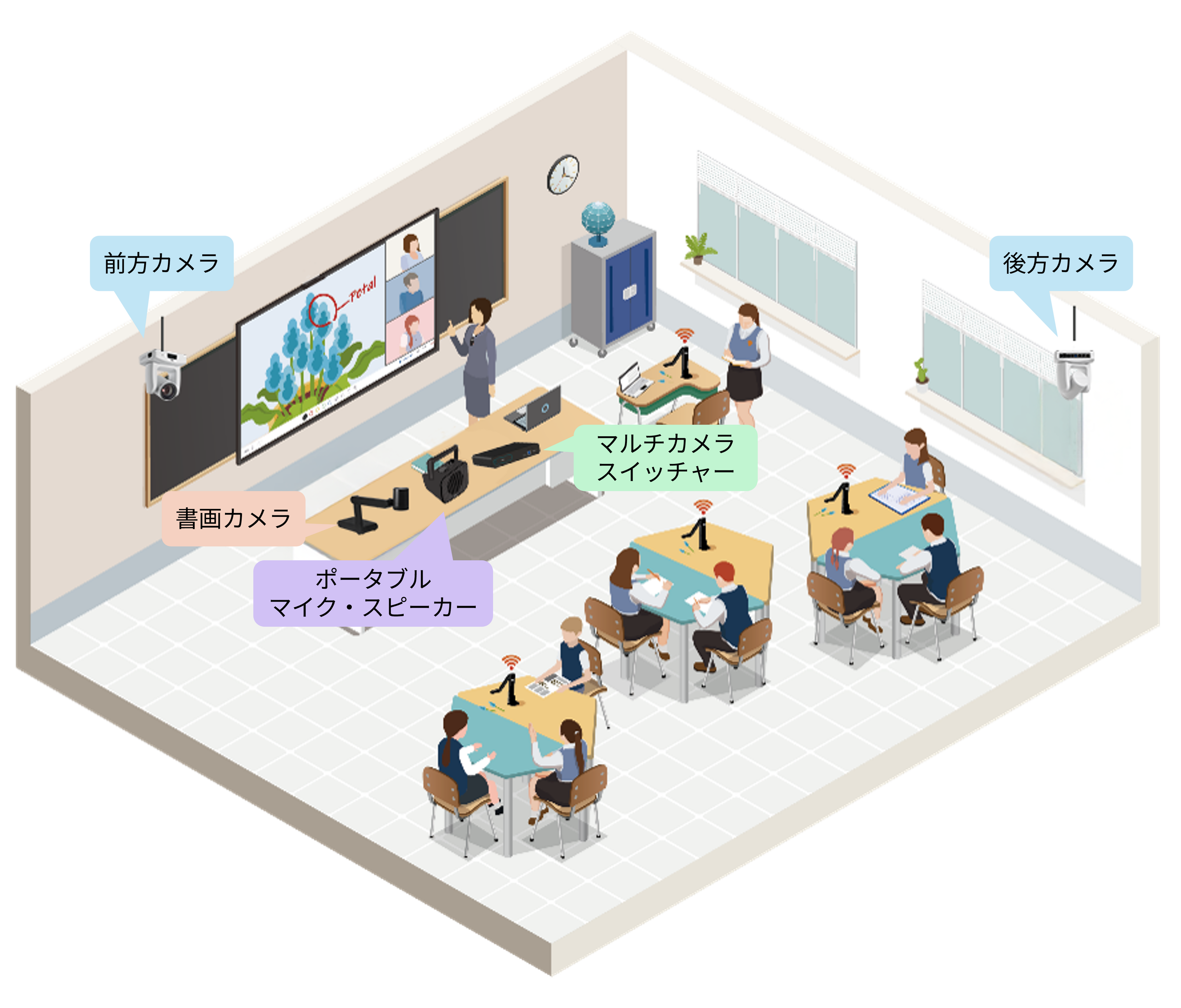 - 教室後方のカメラで、前方にいる先生や板書を撮影します。※AI自動追尾機能を使用
