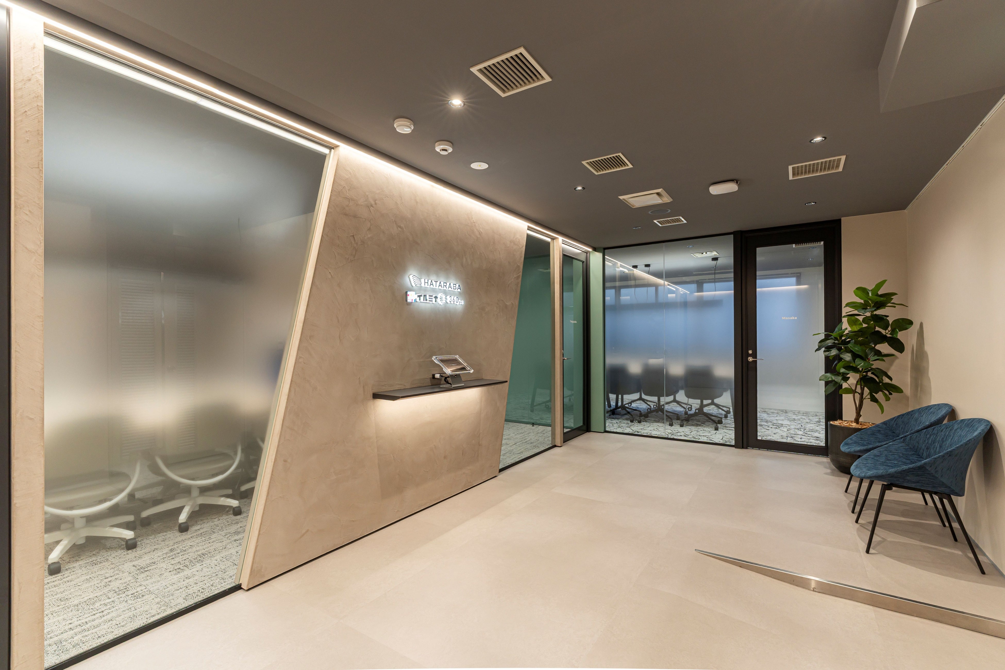エントランス・ミーティングルームは空間に変化を与えるために斜めの壁とし、視線の流れや余白のバランスを丁寧に調整することで、ミニマルでありながら印象に残る構成としています。