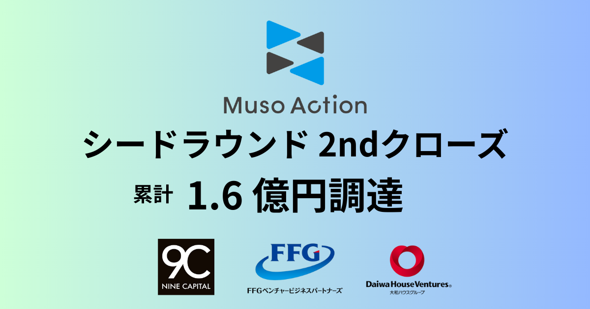Muso Action株式会社(本社:東京都千代田区、代表取締役CEO:村山 龍太郎、以下「Muso Action」)は、シードラウンドのセカンドクローズにおいて、J-KISS型新株予約権による資金調達を実施し、創業融資を含めた累計資金調達額が総額1.6億円となったことをお知らせします。