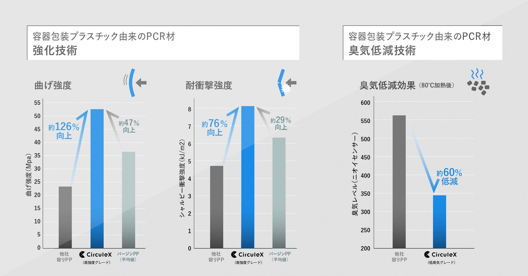 独自の配合・混錬技術で改質を図り、「CirculeX」は使用済みの容器包装プラスチック由来のPCR材でありながら、曲げ強度は、従来のPCR材と比較して約126%、バージンプラスチックと比較して約47%、耐衝撃強度は、従来のPCR材と比較して約76%、バージンプラスチックと比較して約29%、従来のPCR材やバージンプラスチックを上回る強度を実現しました*。建築資材、物流資材、自動車部品など、耐久性が求められる様々な分野での利用が可能です。
