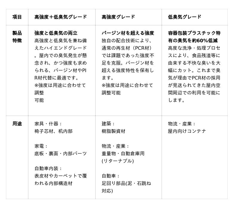 こうした中、TBMは、LIMEX事業で培った素材開発の独自の配合・混錬技術や横須賀サーキュラー工場のプロセス改善を通じて、PCR材の強度不足や臭気改善といった品質課題を抜本的に解決し、供給逼迫と価格高騰が続くPIR材やバージンプラスチックの製品用途に活用可能な高機能再生材「CirculeX」の開発に成功しました。