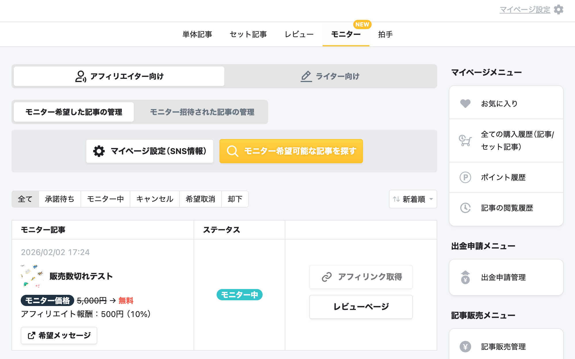 [画像2: https://prcdn.freetls.fastly.net/release_image/162525/2/162525-2-b6b9b954a677b7809f910dba2c6efc9b-1436x722.png?width=536&quality=85%2C75&format=jpeg&auto=webp&fit=bounds&bg-color=fff ]モニター機能は、有料記事を販売する「ライター」と、記事内容を確認した上で紹介・アフィリエイ