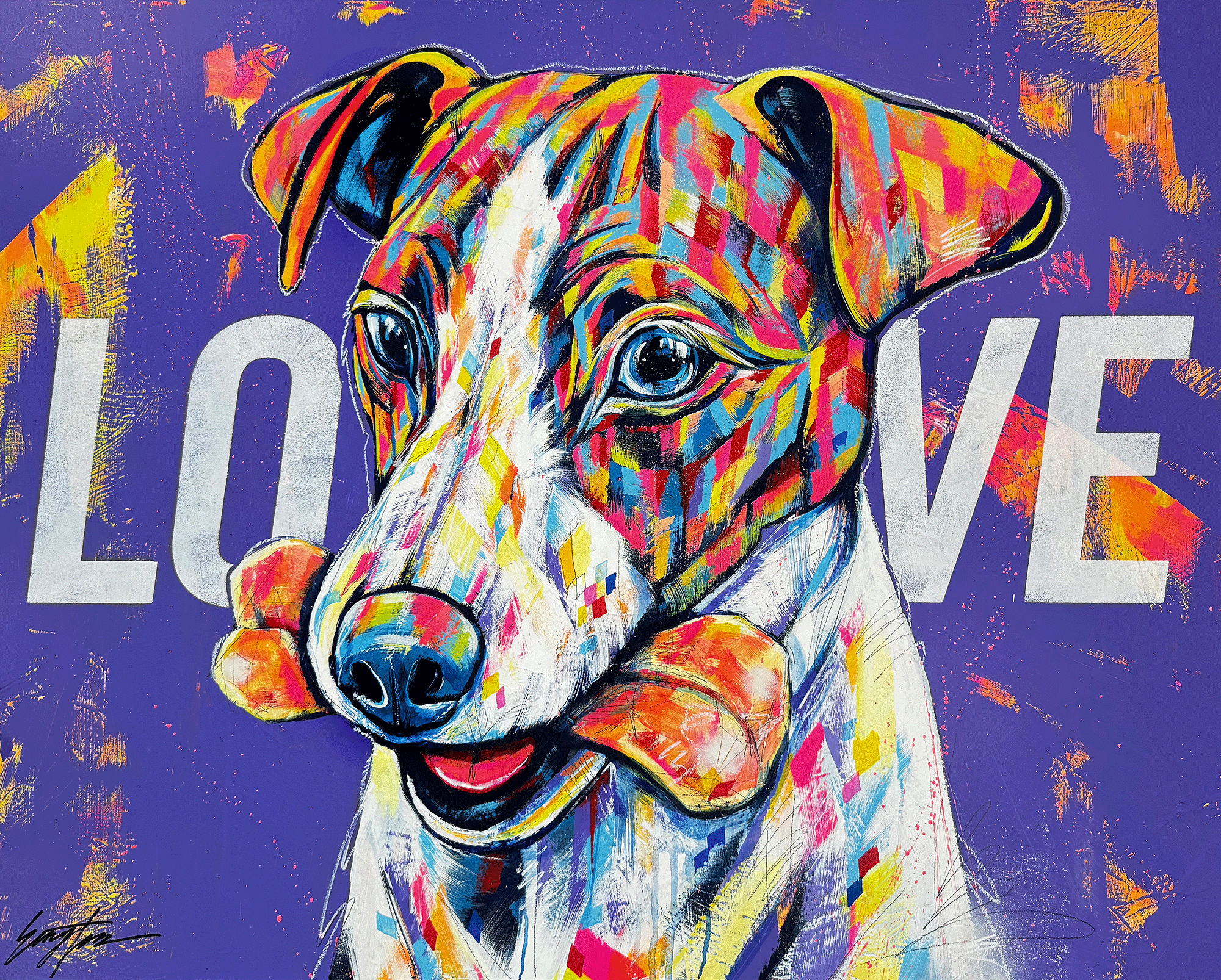 伝統的な肖像画の構造をベースにしながらも、そこに大胆で革新的な表現を加えることで、観る者に強烈な印象を与える。豊かな色彩と力強い筆致によって、表情のわずかなニュアンスまで丁寧に描き込み、それぞれの犬が持つ「魂」と「個性」をキャンバスに刻み込んでいる。