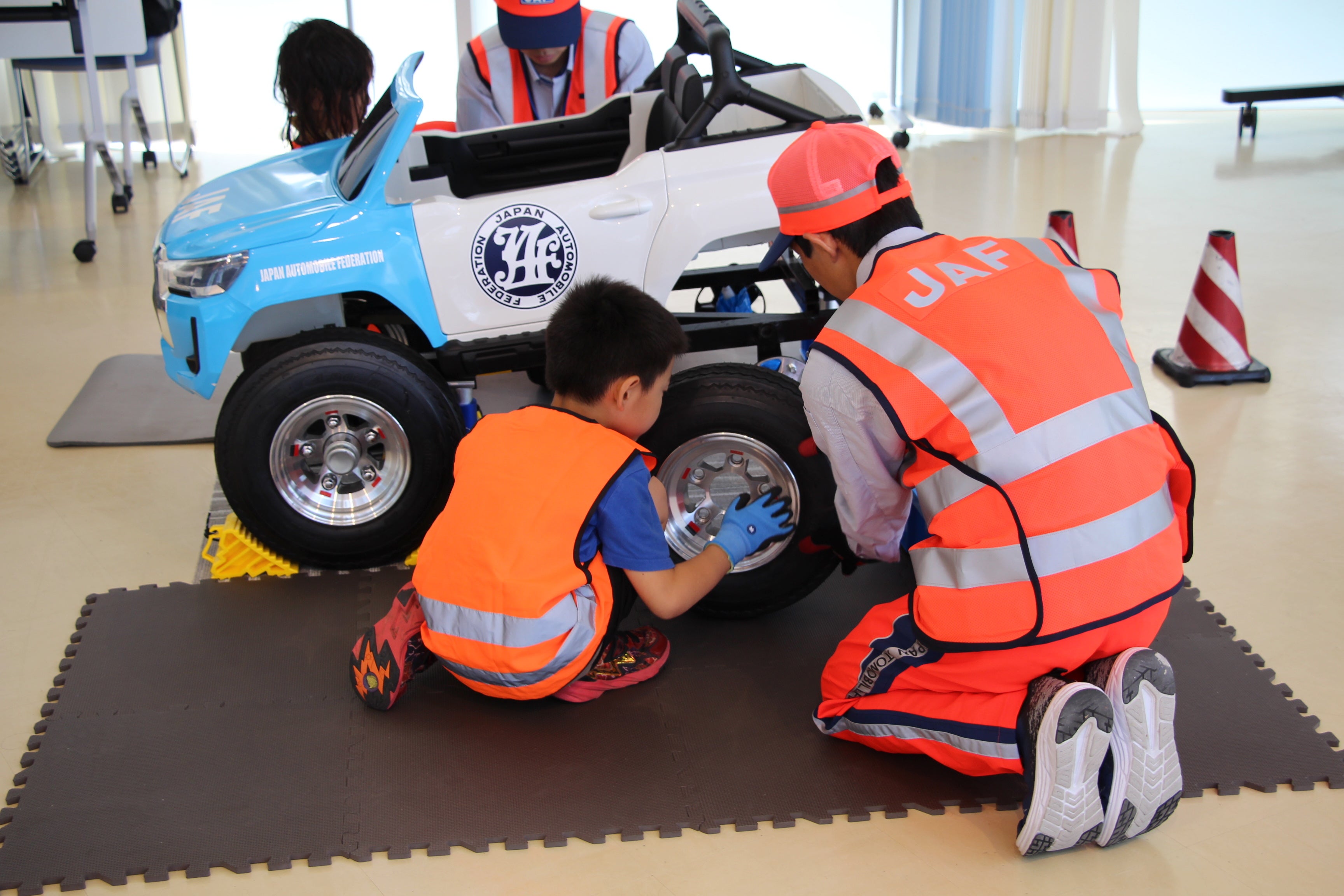 未来のロードサービス隊員集合!制服を着用して「安全対策」や「タイヤの取り付け」にチャレンジできます。