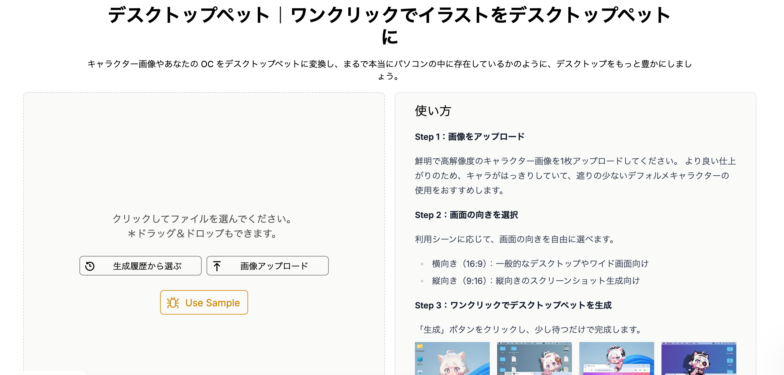 「デスクトップペット生成ツール」は、キャラクター画像をもとに、PCデスクトップに自然に溶け込む表現を自動生成できる機能です。主な特長