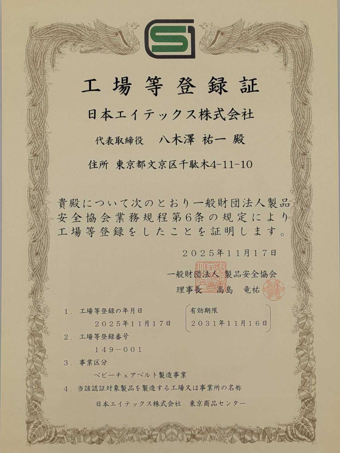 日本エイテックス株式会社(本社:東京都文京区、代表取締役:八木澤祐一)は、このたびベビーチェアベルト製造事業において、一般財団法人 製品安全協会が定めるSG登録工場となりました。