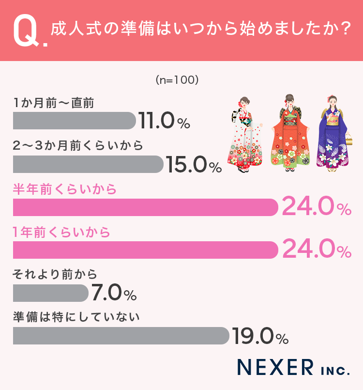 ということで今回は振袖レンタル、振袖販売の和らいふと共同で、事前調査で「成人式に参加した」と回答した女性100名を対象に「成人式の準備」についてのアンケートを行いました。