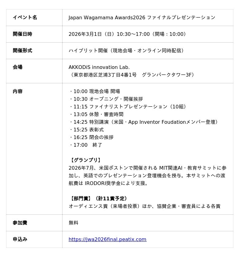 MITの教育プラットフォームを展開する App Inventor Foundation との公式連携により実施され、選出された10組のファイナリストは、2026年3月1日に東京で開催されるファイナルプレゼンテーションに登壇。グランプリ受賞者は日本代表として、同年7月に米国MITで開催される世界大会への出場権を手にします。