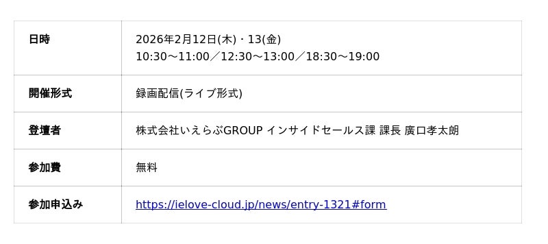 不動産業界特化のDX支援サービスを展開する株式会社いえらぶGROUP(本社:東京都新宿区、代表取締役:岩名泰介、以下「いえらぶGROUP」)は、2月12日(木)・13日(金)の2日間、録画配信(ライブ形式)にて、「ネット集客×スマホCRM追客」により反響・成約を最大化する地方不動産向け戦略セミナーを開催いたします。
