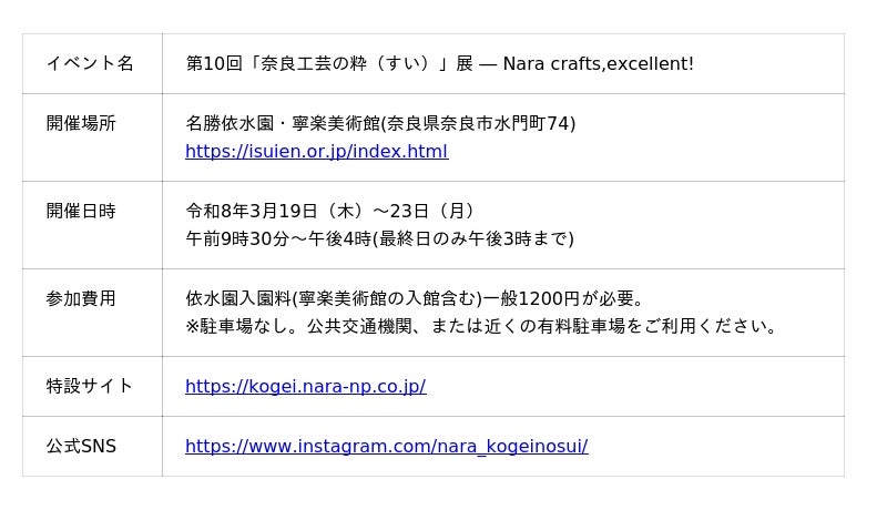株式会社奈良新聞社(本社:奈良市法華寺町2番地4、代表取締役:田中篤則)は、第10回「奈良工芸の粋」展を3月19日から5日間の日程で開催します。