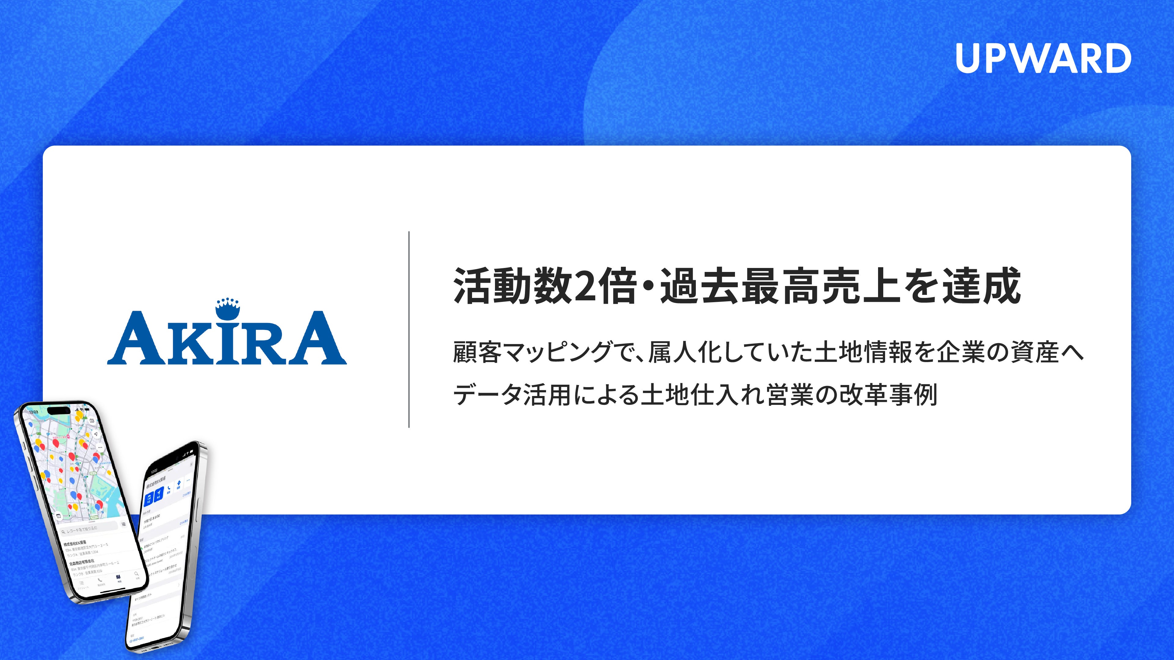 UPWARD株式会社(所在地:東京都千代田区、代表取締役 CEO:金木 竜介、以下 UPWARD)は、不動産事業や解体・造成事業などを展開するアジアグループの1社、株式会社アキラ(本社:埼玉県三芳町、代表取締役:大宮 博文、以下 アキラ)の外回り営業DXに関する「UPWARD」の活用事例インタビューを公式サイトにて公開しました。