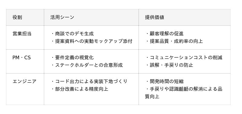 アイリッジのナレッジを詰め込んだ専門システムプロンプトを内包することにより、簡易な指示でも、UI/UXの原則を損なわない安定した品質のモックアップを作成可能です。また、実機確認やQRコードによるテストユーザーへの共有も即座に行えるため、手戻りリスクを最小限に抑えられます。