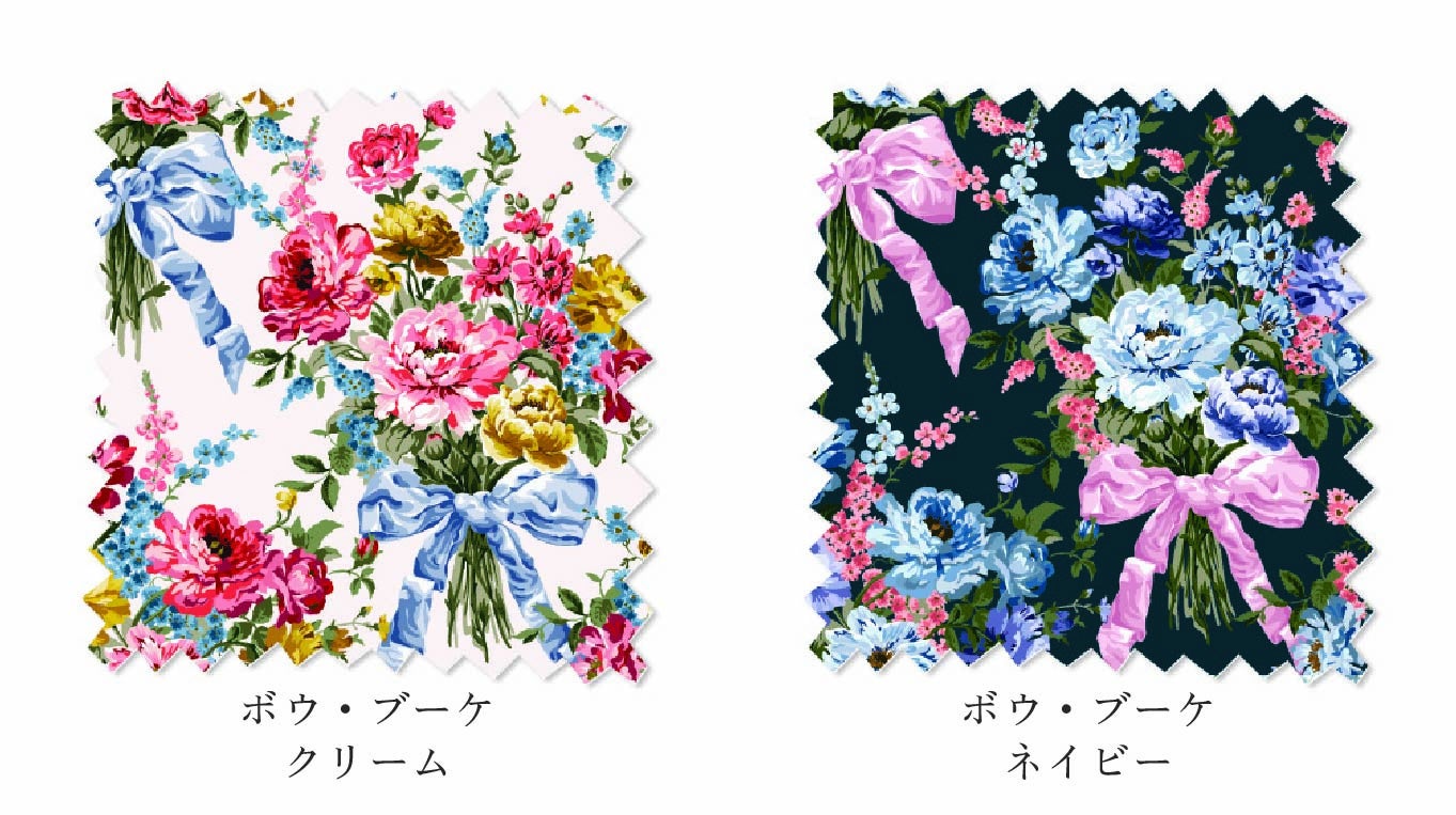 ボウ・ブーケは、まるでブリジャートン家の庭園から飛び出してきたかのような、バラ、アスター、ライラック、ラークスパー、ピオニーといった華やかな花々を描いた豪華なパターンと豊かな色彩、そして自然の美しさが織りなす万華鏡のような美しさを表現し、繊細なリボンでブーケを表したデザインです。