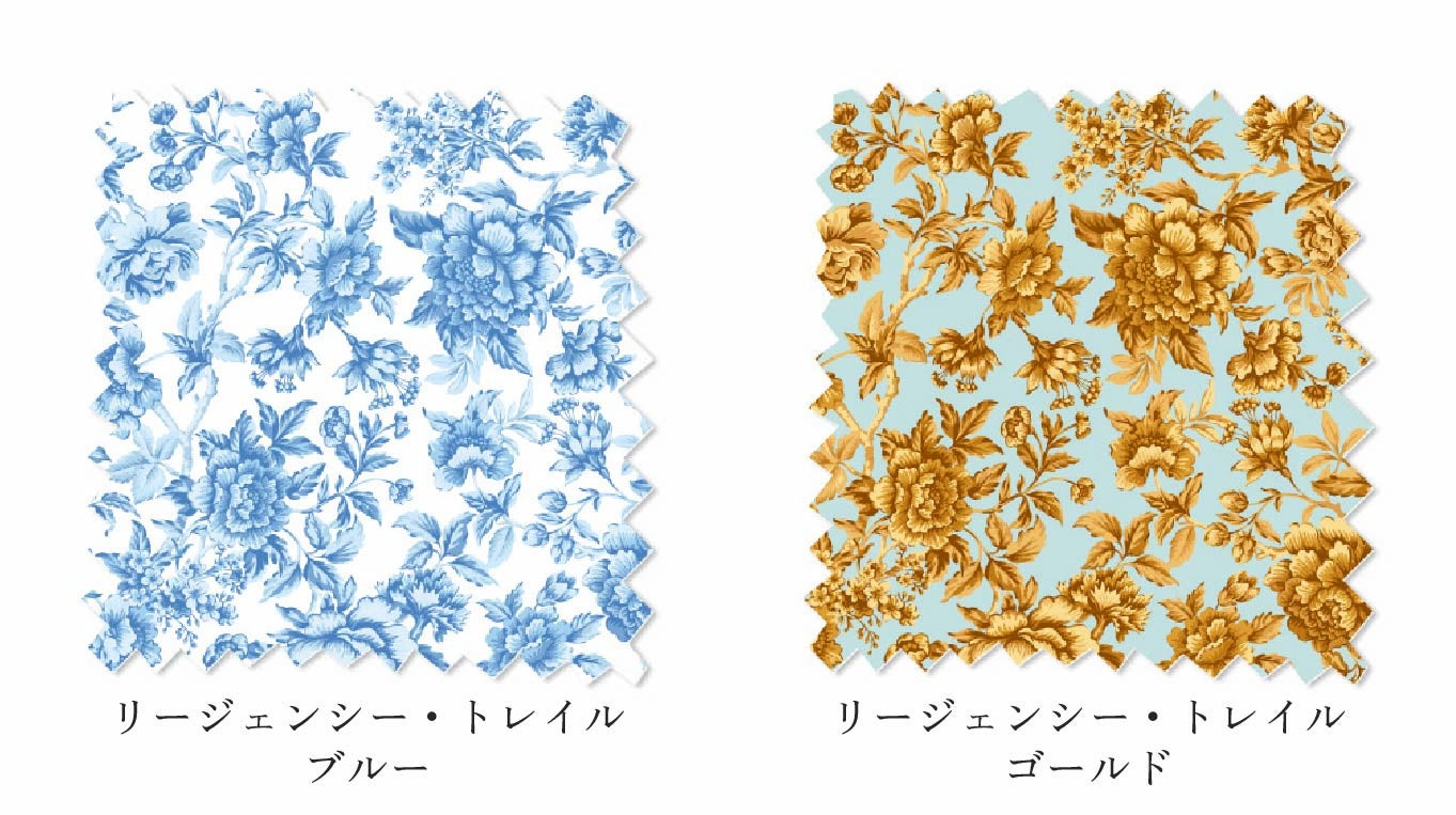 リバティの伝統的なデザイン「ツリー・オブ・ライフ」を昇華させたリージェンシー・トレイルは、優美な牡丹、菊、カーネーション、桜、フクシアが花咲く枝と豊かな緑が特徴です。1969年の手描きアートワークに着想を得たトーンのグラデーションがコントラストと奥行きを生み出し、ブリジャートンらしい洗練された優雅な趣を醸し出しています。