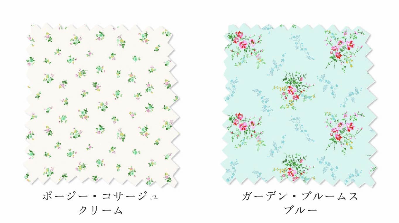 しなやかで繊細、そしてロマンチックなポージー・コサージュのデザインは、1865年頃のリバティ社所蔵書物から発見された手描きの原画片に由来します。淡く軽やか に散りばめられた模様がさわやかで清々しい印象を醸し出し、やさしいパステルカラーは、新緑の庭に咲き誇る摘みたての花々を思わせます。