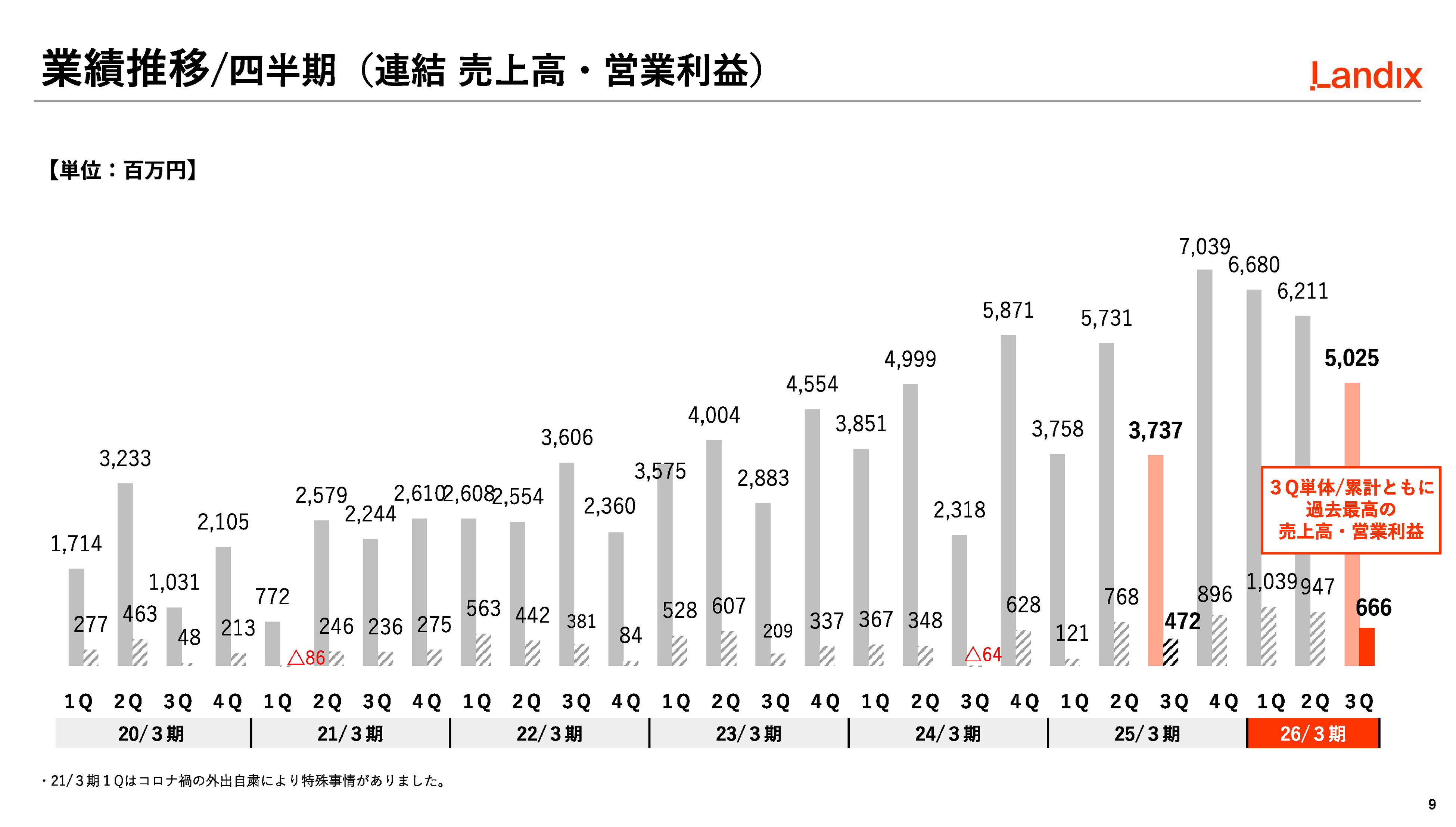 四半期の業績推移においては、26/3期3Qで単体・累計ともに過去最高の売上高・利益を更新しております。