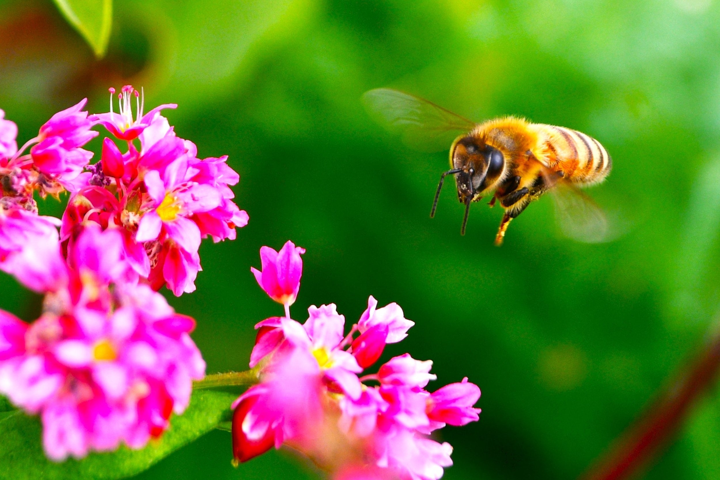 鮮やかなピンク色の高嶺ルビーに、一匹のミツバチが訪れた瞬間を見事に捉えた一枚です。