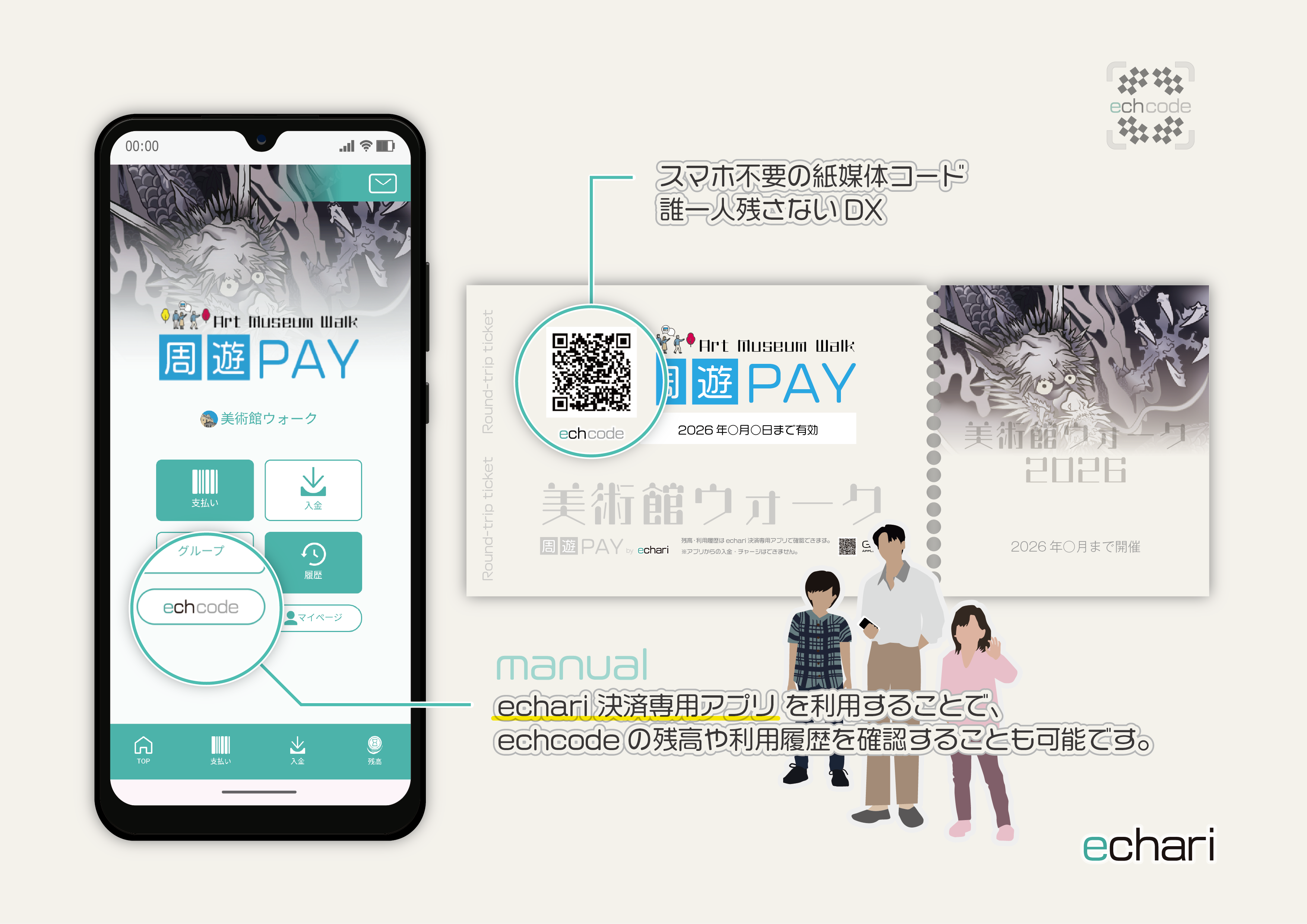 echcode(以下、echコード)は、利用時に個人情報の登録やアカウント作成を必要とせず、グループ内でコードを提示するだけで、あらかじめ設定された金額・期限の範囲内で決済が可能です。残高管理や期限制御はデジタル上で一元管理されており、短期間のイベントから、デジタルデバイド層や電波環境が不安定な屋外会場まで、幅広い環境で確実に機能する決済手段として設計されています。