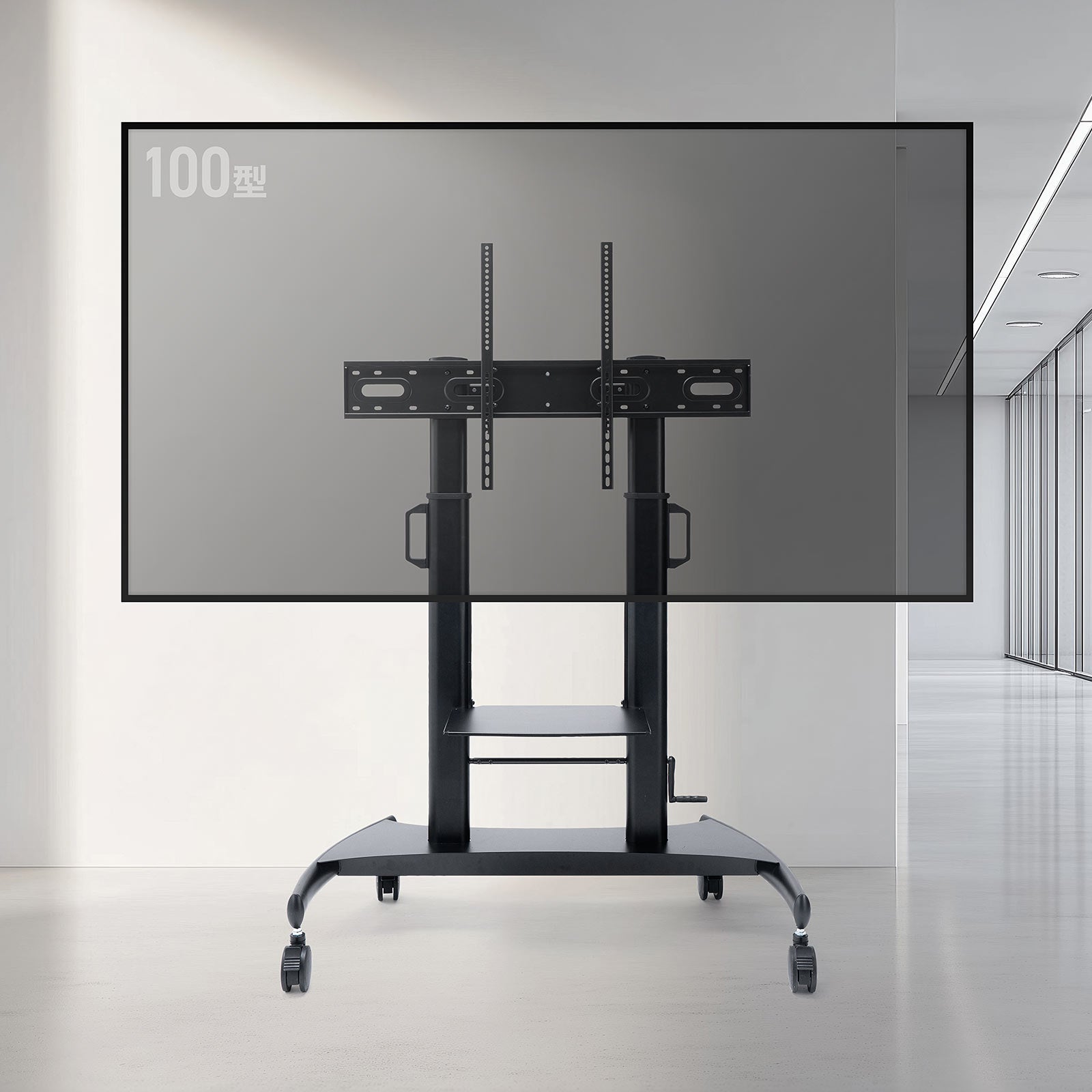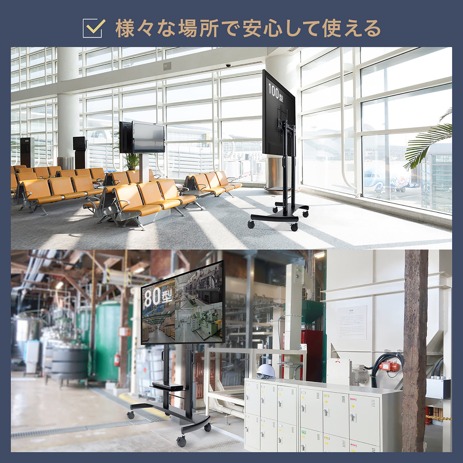 60~100インチクラスの大型ディスプレイに対応し、最大100kgまで支える高耐荷重設計を採用しています。フレームにはスチール素材を使用し、重量級ディスプレイでもたわみや揺れを抑えた安定した設置が可能です。大型ディスプレイの導入に不安を感じていた会議室や商業施設、教育現場でも、安心して活用できます。