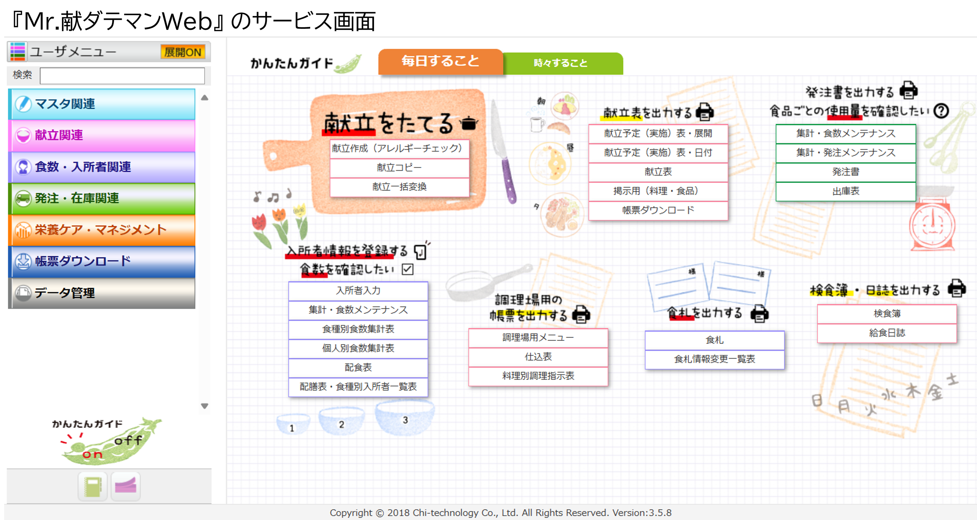 『Mr.献ダテマン』シリーズは、給食運営を支援する栄養・給食管理システムです。約40年のサービス提供と、シリーズ累計22,000件以上の導入という豊富な実績を有しています。2018年にリリースされた完全クラウド型サービス『Mr.献ダテマンWeb』は、インターネット環境があれば、いつでも・どこでも利用可能なシステムとして、日本全国7,000事業所以上で活用されています。
