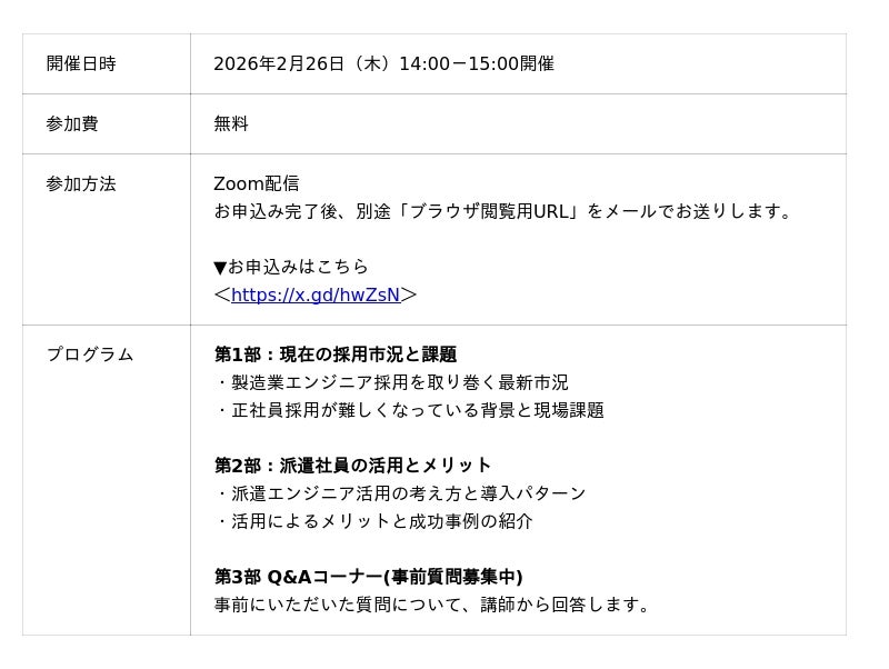ウィルグループの総合人材サービスを手掛ける株式会社ウィルオブ・ワーク(本社:東京都新宿区、代表取締役社長:村上 秀夫)は、無料オンラインセミナー「製造業人事必見『応募ゼロ・若手未定着』を終わらせる派遣エンジニア活用法」を、2026年2月26日(木)に開催します。