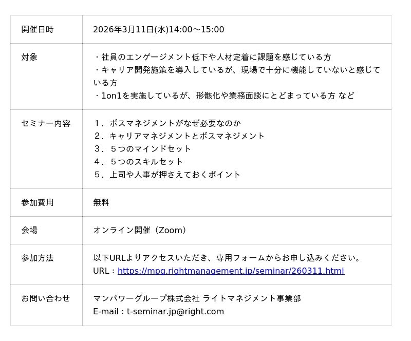 総合人材サービスのマンパワーグループ株式会社(本社・東京都港区、代表取締役社長:池田 匡弥、以下マンパワーグループ)は、3月11日(水)に書籍『ボスマネジメント』※¹(3月出版)を記念した無料オンラインセミナーを開催します。本セミナーでは、上司との関係性によって仕事を円滑に行うための考え方を軸に、コミュニケーション視点から実務に活かせるポイントを紹介します。
