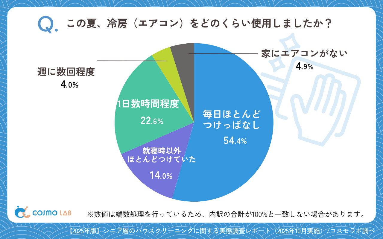 「毎日ほとんどつけっぱなし」(54.4%)が最多となり、冷房を常時使用する実態が明らかになりました。