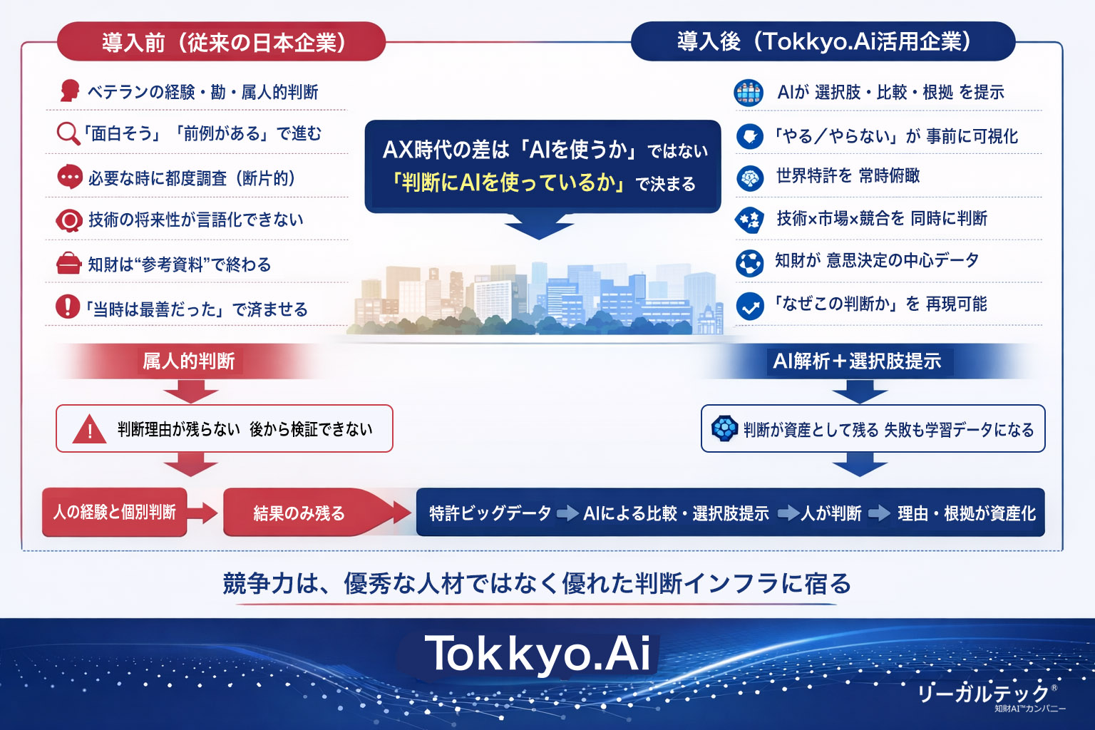 リーガルテック株式会社は、知財を「管理するもの」から「判断に活かすもの」へと転換するための実装基盤を通じて、企業の意思決定の質向上に貢献していく。今後も、特許・知財データとAIを活用し、経営・事業・研究の各判断を支える基盤の高度化を進めていく方針である。