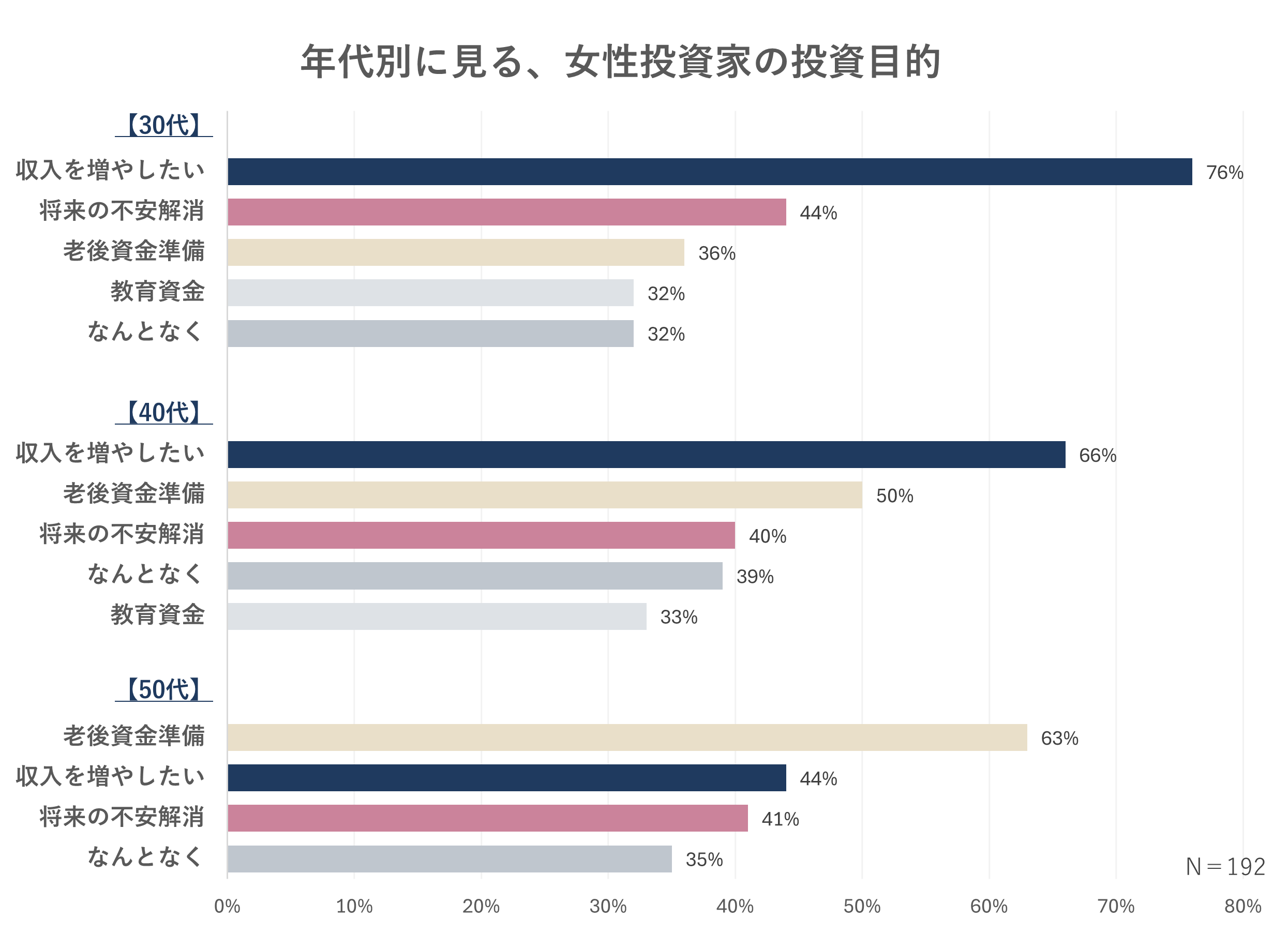 年代別に見る、女性投資家の投資目的※回答数(N=192)※30~50代以外は人数が少ないため本グラフでは省略