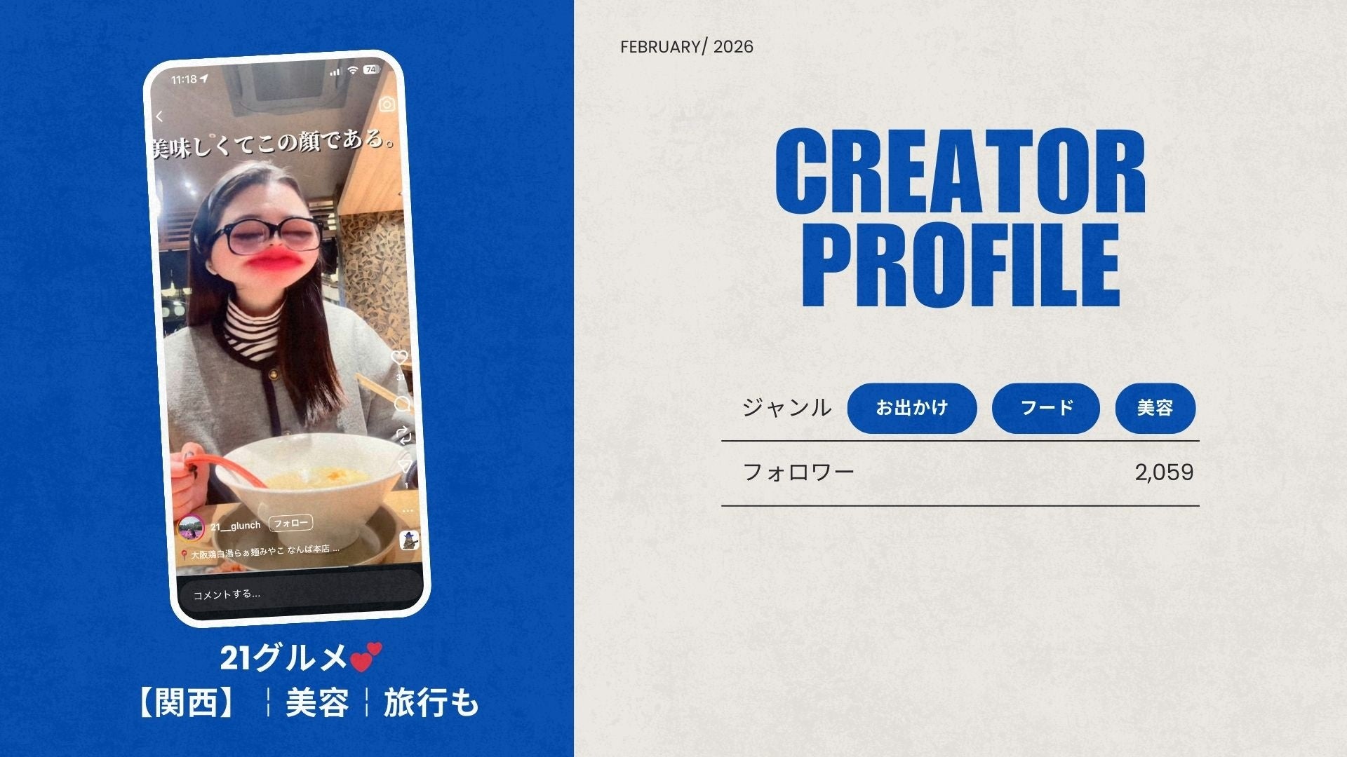「21グルメ(ハート)【関西】¦美容¦旅行も🪽」は、大阪グルメを中心に取材を行い、動画の制作・発信をしています。食分野に強みを持つ同メディアの加盟により、フードやドリンクなど新商品の認知拡大が期待できます。