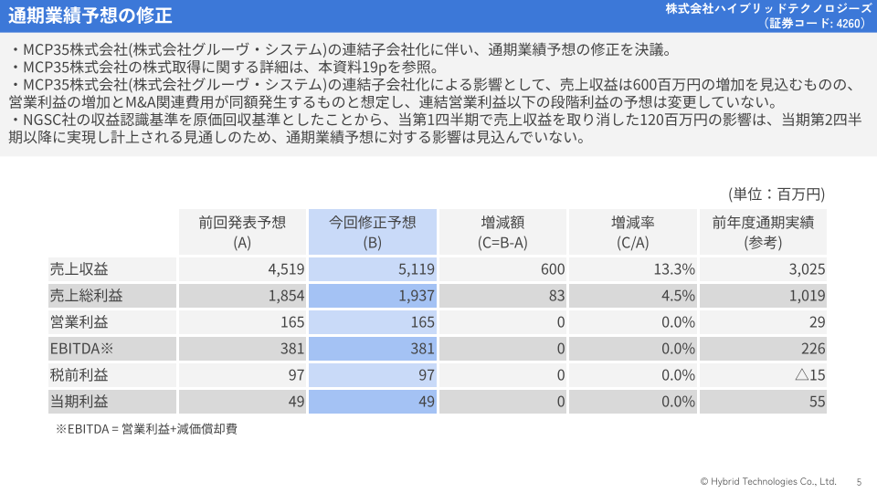2026年1月16日付で、SES事業に強みを持つ株式会社グルーヴ・システムの持株会社であるMCP35株式会社を連結子会社化したことに伴い、通期業績予想を修正いたしました。修正後の予想では、売上収益を5,119百万円(前回発表比+13.3%)を見込んでいます。なお、営業利益以下の各段階利益については、新規連結による利益の増加分と、M&Aに関連して当期に発生する一時的な費用の発生額が同程度となることを見込み、本修正では据え置いております。また、NGSC社の収益認識基準の調整については、通期では解消される見通しであるため、通期予想への影響には含んでおりません。