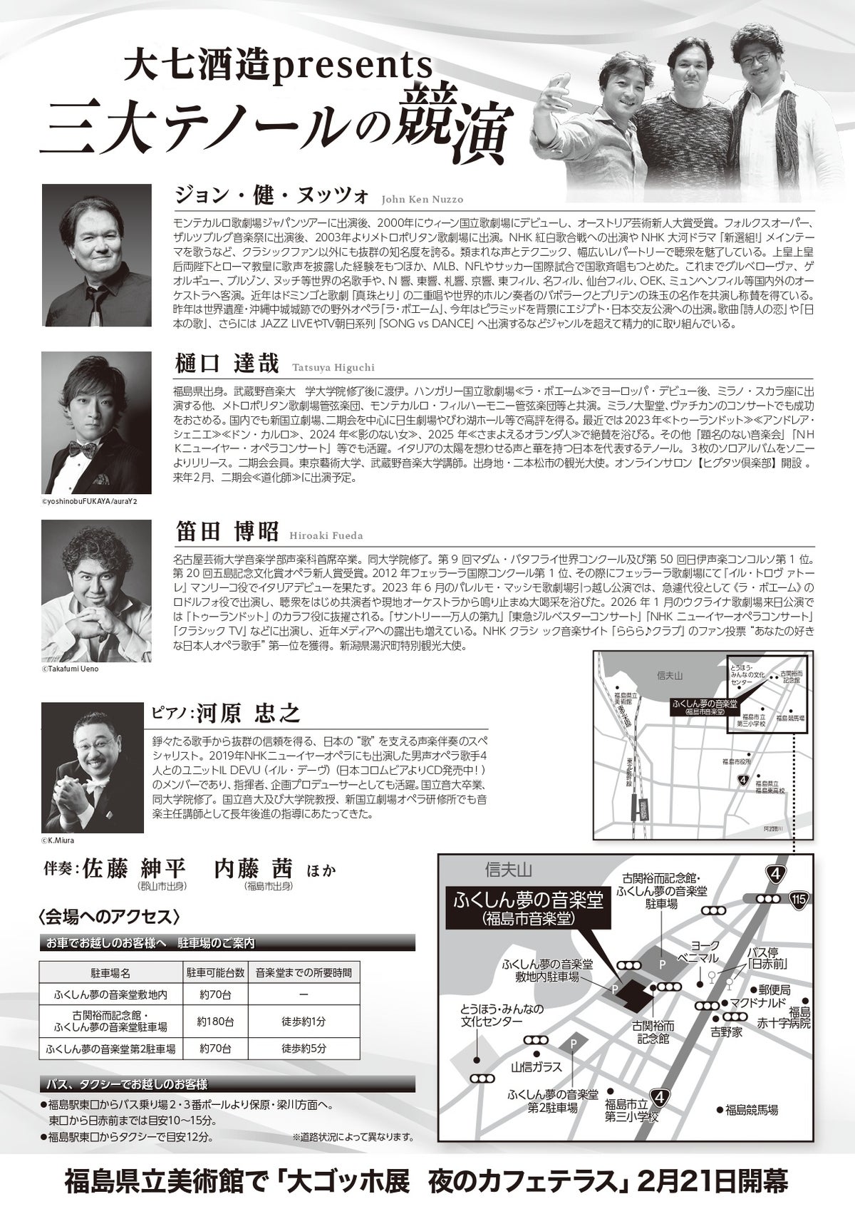 本公演は2024(令和6)年11月25日に開催され、福島市音楽堂を大きな感動と喝采で包み込んだ公演に続く、第2弾のコンサートとなります。前回と同じくジョン・健・ヌッツォさんと樋口達哉さん、笛田博昭さんの3人が福島の地に再集結。国内外のオペラ界で第一線を走り続ける“伝説の三大テノール”が、さらにパワーアップした歌声を届けてくれます。