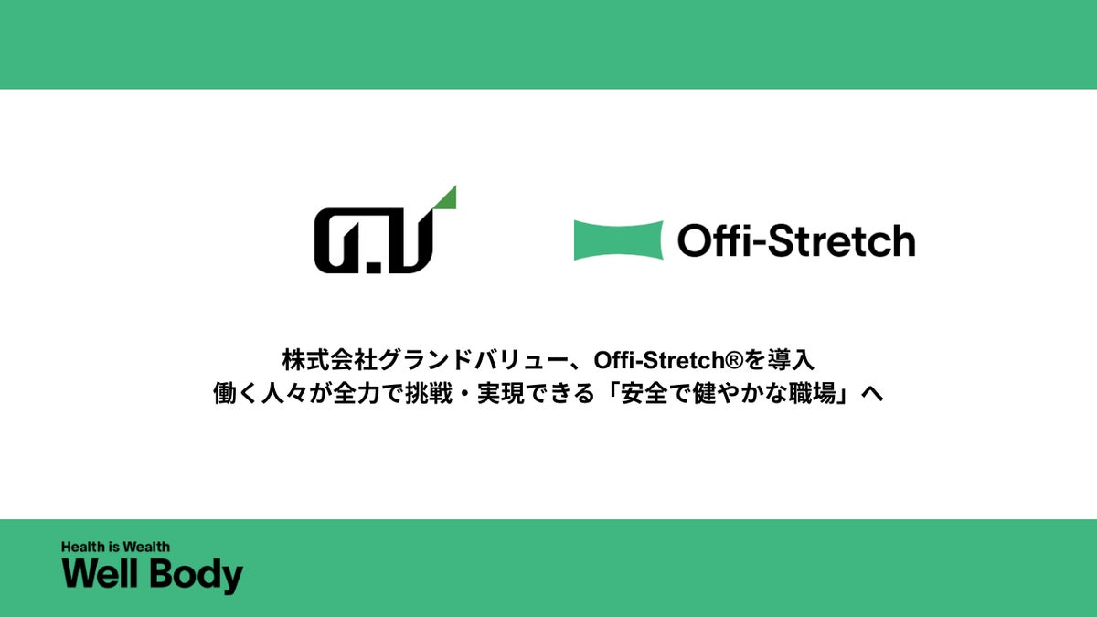 Well Body株式会社(本社:東京都渋谷区、代表取締役:水野 純一・吉村 直途)は、この度、株式会社グランドバリュー(本社:東京都江戸川区、代表取締役:古橋 慶樹)の社内福利厚生および健康経営施策の一環として、企業向けフィジカルケアサービス「Offi-Stretch(R)(オフィストレッチ)」の導入が決定したことをお知らせいたします。