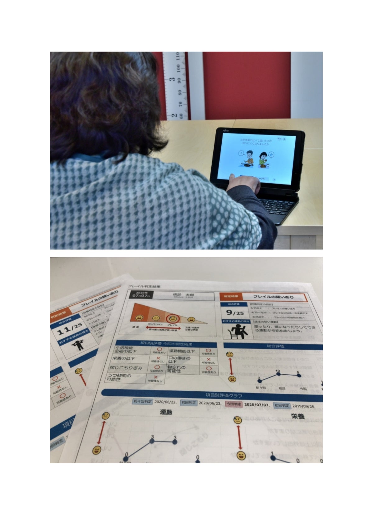 住民主体の通いの場や自治体主催のフレイル予防教室等の会場で、高齢者ご本人に簡単に回答いただき、その場で結果を判定・出力(表示/印刷)できます。クラウドサービスのため、専用ソフトのインストールは不要で、インターネット環境があれば場所を問わず利用可能です。