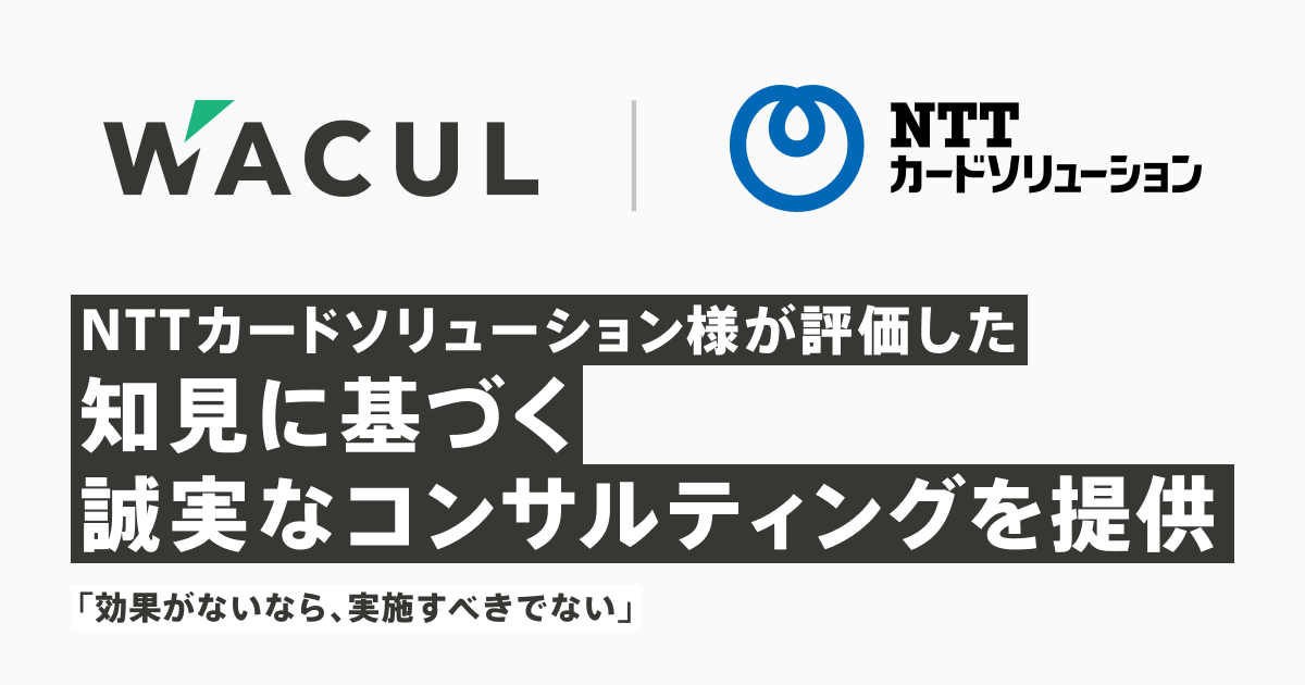 データと知見を核に、戦略から実行までマーケティングDXを一気通貫で支援する株式会社WACUL(本社:東京都千代田区、代表取締役社長:大淵 亮平、読み:ワカル、以下当社)は、決済・金融領域における各種サービスを展開する株式会社エヌ・ティ・ティ・カードソリューション(以下、株式会社NTTカードソリューション、住所:東京都品川区、代表取締役社長:赤星 賢太)に、当社のSEOコンサルティングを起点として、デジタルマーケティング伴走支援および広告運用支援など、複数のサービスをご導入いただいたことをお知らせいたします。