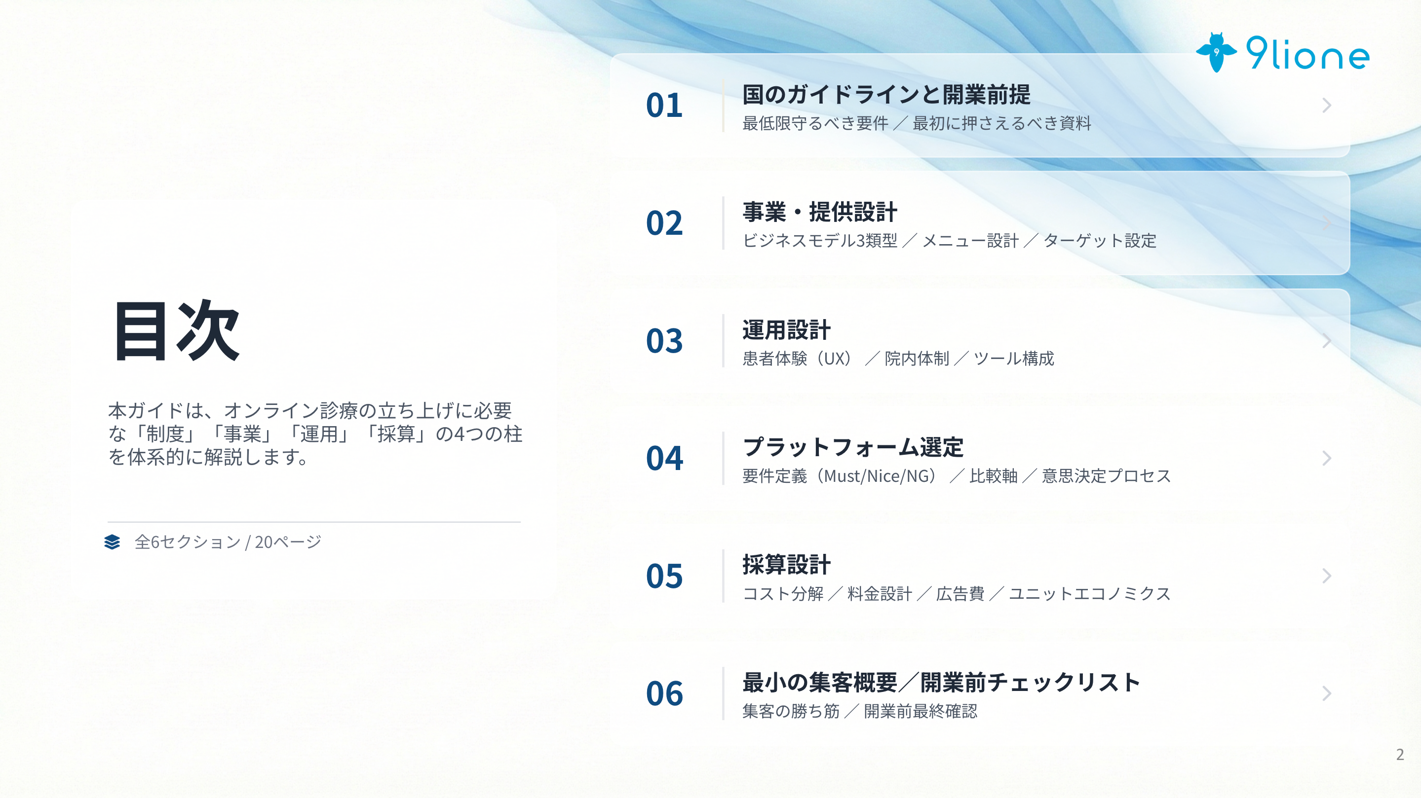 株式会社9lione(本社:東京都練馬区、代表取締役:廣田雄将)は、開業医・医療法人向けの無料資料「オンライン診療 新規開業スタートガイド」を公開しました。