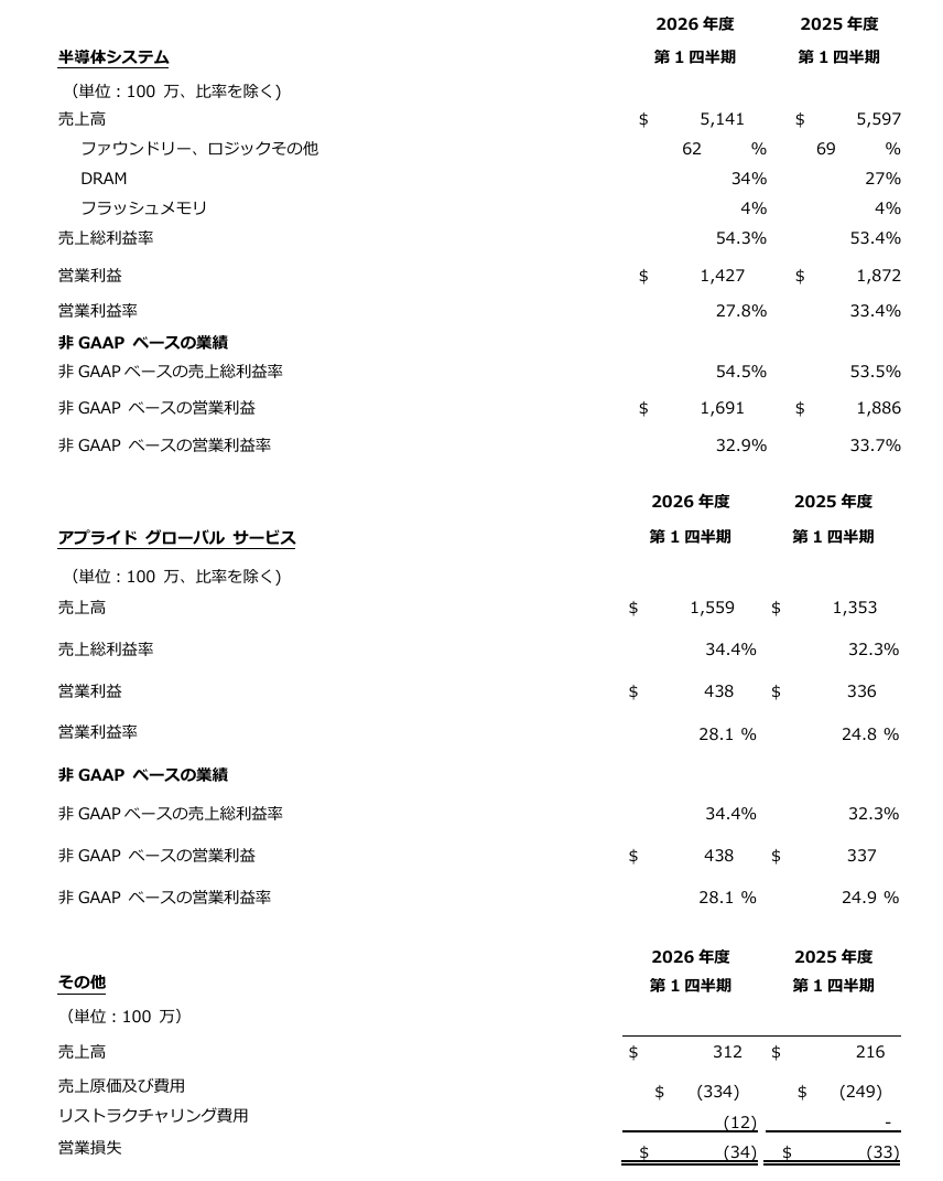 2026年度第1四半期から、経営陣は200mm装置事業をアプライド グローバル サービスから半導体システムに移管しました。さらに、2026年度第1四半期より本社サポート費用を各事業セグメントに完全配賦します。過年度の数字は本年度の表示に合わせて修正再表示されています。ディスプレイ事業セグメントの財務業績は以下の「その他」に示す科目残高に含まれています。