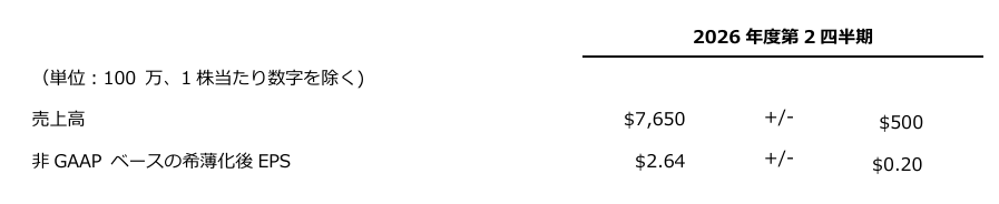 2026年度第2四半期の売上高と非GAAP ベースの希薄化後1株当たり利益の見通しは、以下のとおりです。
