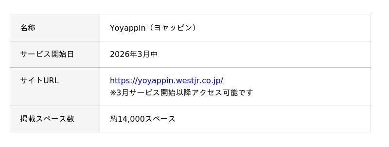 株式会社スペイシー(東京都港区、代表取締役:平川 雅一、以下「スペイシー」)は、西日本旅客鉄道株式会社(大阪市北区、代表取締役社長:倉坂 昇治氏、以下「JR西日本」)と共同で新・スペース体験予約サービス「Yoyappin(ヨヤッピン)」を2026年3月にリリースします。ワークスペースを中心に全国約1.4万カ所の様々なスペースを予約できるようになり、JR西日本やJR九州の会員基盤とも連携することで利用者層を拡大し、またスペース利用によってWESTERポイントがためられるなど、便利でお得なユーザー体験を提供してまいります。