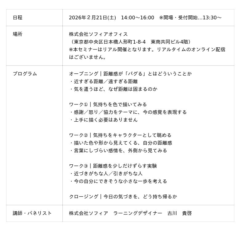 本ワークショップでは、距離感を「正す」「改善する」ことを目的とせず、