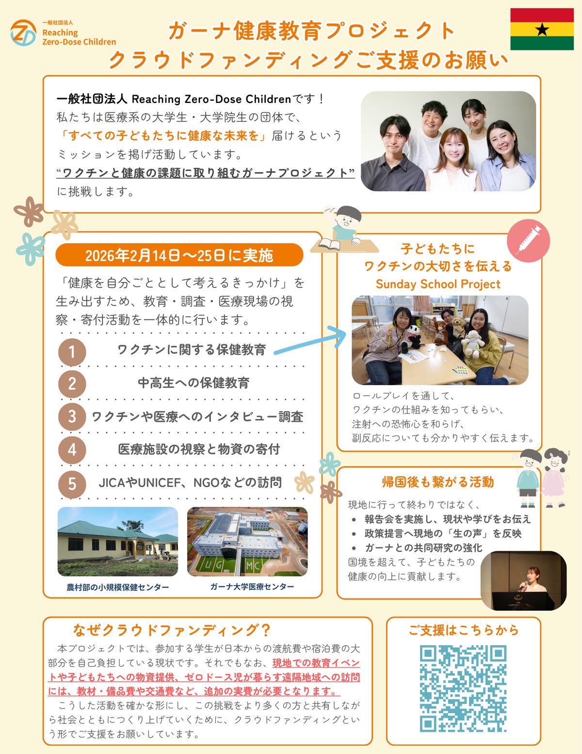 一般社団法人Reaching Zero-Dose Childrenは、2026年2月1日にクラウドファンディングサービス「CAMPFIRE」でプロジェクト「ガーナのワクチンの課題に挑む! 暮らしの中で育む健康習慣 未来の子どもたちへ」を開始し、支援受付をスタートしました。