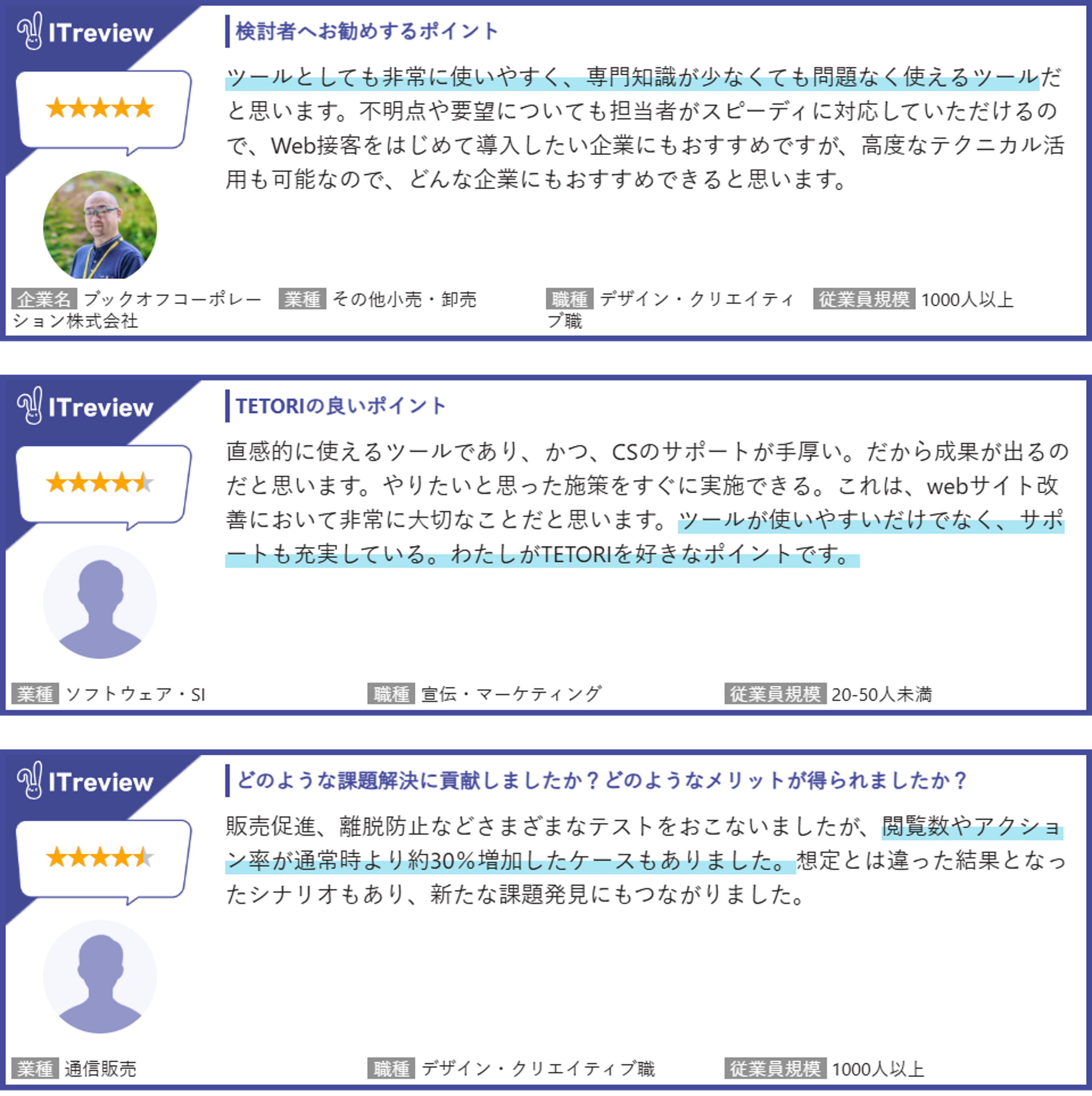 「ITreview」に投稿されたTETORI利用者のレビュー(一部抜粋)