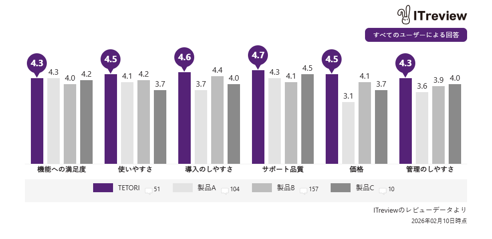 Web接客ツール「TETORI(テトリ)」は、ITreview上で実際のユーザーから寄せられた評価において、「機能への満足度」「使いやすさ」「導入のしやすさ」「サポート品質」「価格」「管理のしやすさ」 の6項目で高い評価を頂いています。特に「使いやすさ」「導入のしやすさ」「サポート品質」「価格」では4.5~4.7点と高い評価を受けており、導入がしやすく、導入後も安心して活用できるツールとして多くの企業に支持されています。