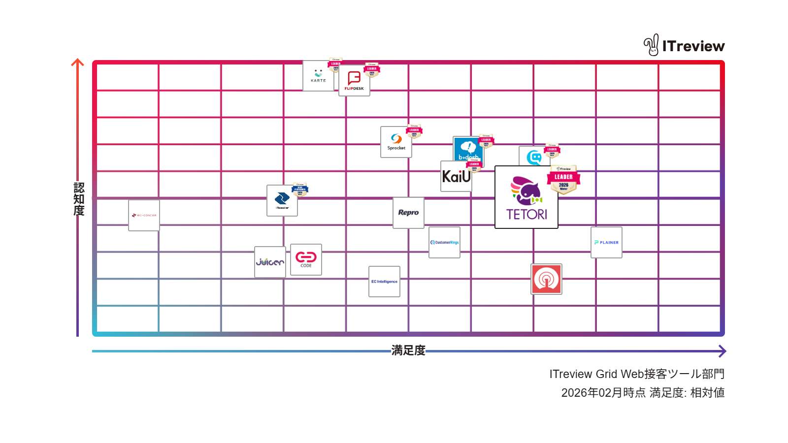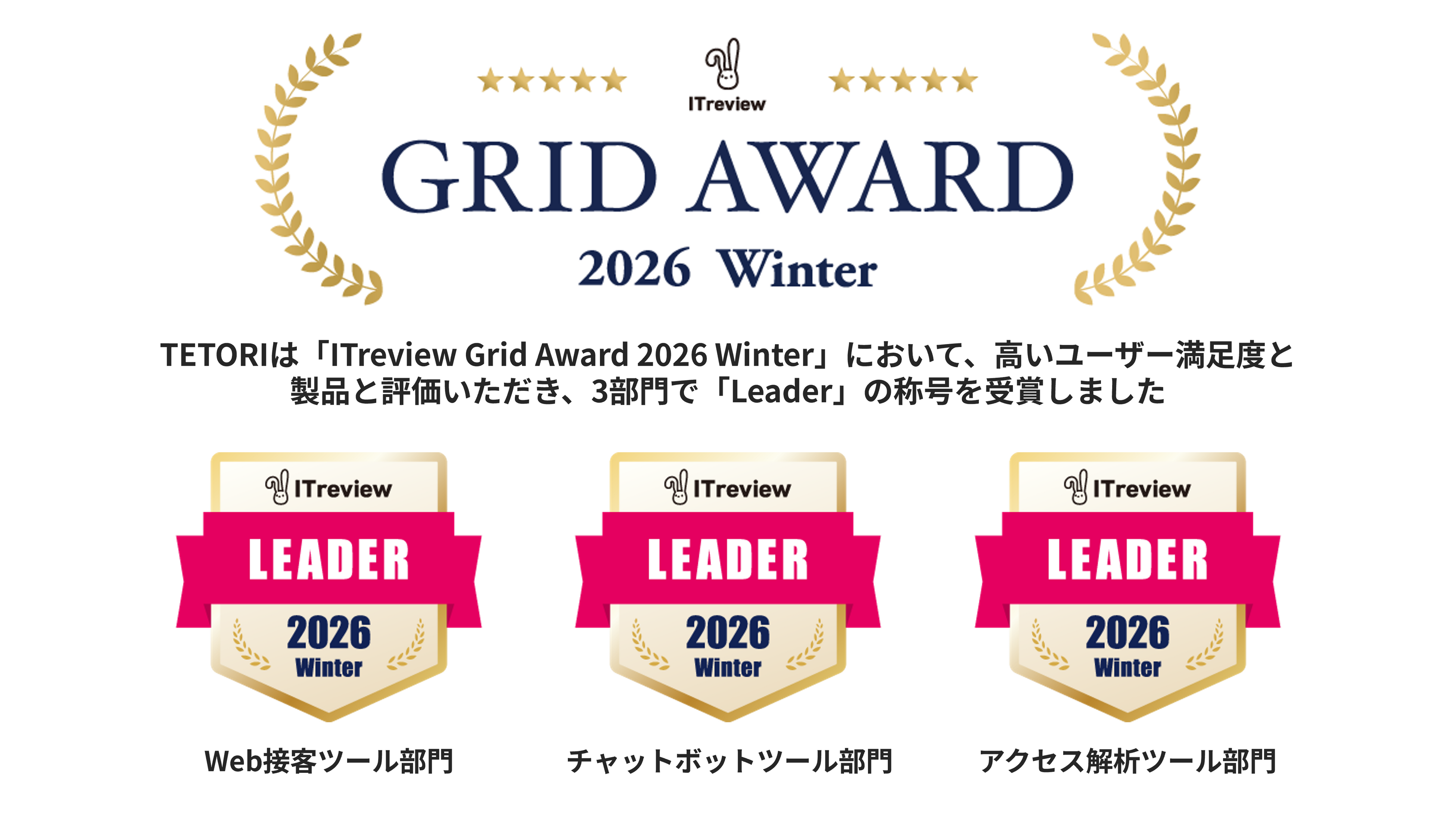 このたび、Web接客ツール「TETORI(テトリ)」は、「ITreview Grid Award 2026 Winter」において、「Web接客ツール部門」、「チャットボットツール部門」、「アクセス解析ツール部門」 の3部門で、高い顧客満足度と認知度を兼ね備えた製品として評価され、「Leader」称号を受賞いたしました。