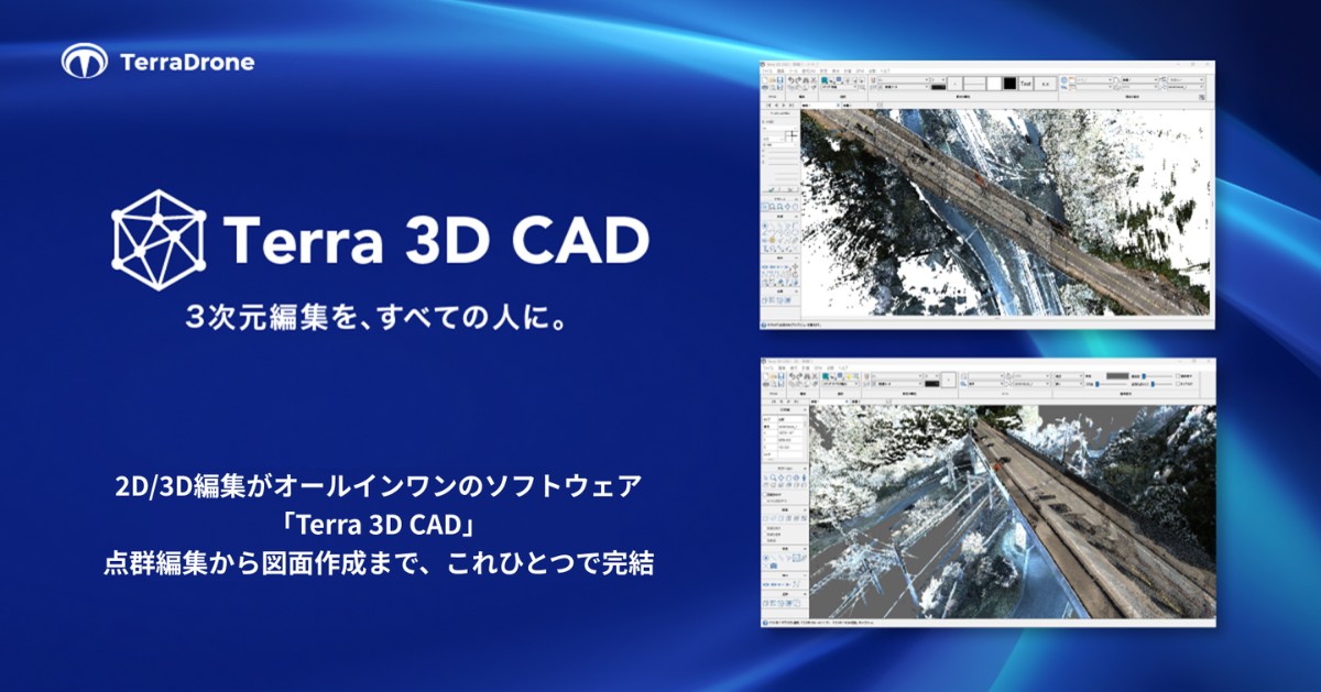 Terra Drone株式会社(本社:東京都渋谷区、代表:徳重 徹、以下 テラドローン)は、2026年2月18日より、自社開発の3次元編集ソフトウェア「Terra 3D CAD」の提供を開始いたしました。本製品は、3次元点群データの編集から2次元図面の作成までを一貫して行うことができるソフトウェアです。自社製品である3次元計測器「Terra Lidarシリーズ」および「Terra SLAM RTK」との組み合わせにより、計測から成果物作成まで一貫したトータルソリューションの提供が可能になります。