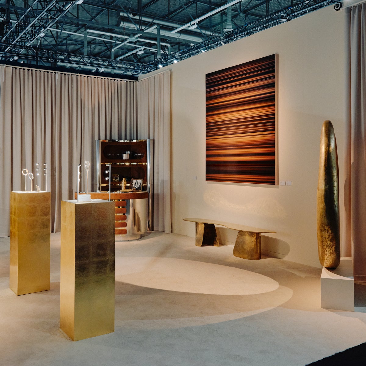 メゾンは特に、コンテンポラリー クリエイションとフランスのメティエ・ダールの卓越性を推進するScene Ouverteギャラリーと協力しました。同ギャラリーでは、Francisco Aniorteによるラッカー仕上げのスチールと手描きのセラミックタイルで作られたユニークな「Boira」テーブルが展示されました。メゾンはまた、ブラジルの古今のコレクティブルデザインを専門とするBrazil Modernistギャラリーとも提携しました。このギャラリーのブースには、Lucas Recchiaのブロンズ製ベンチ「Morfa #09」や、Carlo Haunerのアイコニックな対のアームチェア(1950年)が展示されました。